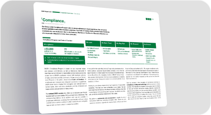 BASF Report 2021 Corporate Governance – Compliance 171 Compliance GRI 102, 103, 205, 206, 406, 407, 408, 409, 412, 413, 418, 419 Our Group-wide Compliance Program aims to ensure adherence to legal regulations, the company’s internal guidelines and ethical business practices. Our Code of Conduct firmly embeds these mandatory standards into our employees’ day-to-day business. Members of the Board of Executive Directors are also expressly obligated to follow these principles. Compliance Program and Code of Conduct We care We Earn Trust We Play Fair We Respect We Protect At a glance – Our Code of Conduct – Anti-Corruption – Antitrust Laws – Human Rights, Labor – Sensitive Company >53,000 77 – How We Make – Trade Control – Gifts and Entertainment and Social Standards Information participants in internal audits on adherence to Decisions – Anti-Money Laundering – Conflicts of Interest – Environmental – Personal Data compliance training our compliance standards – We Always Speak Up Protection, Health and – Digital Responsibility – We Lead Integrity Safety – Company Property ▪ Code of Conduct as the core of our Compliance Program ▪ Systematic further development of our compliance management – Accurate Books and system Records BASF’s Compliance Program is based on our corporate values A new platform for publishing binding Group-wide governance docu- focus on Group companies in 2021. The regular compliance audits and voluntary commitments, as well as international standards. It ments (policies, corporate requirements) provides a more effective performed by the Corporate Audit department are another source of describes our commitment to responsible conduct and expectations search function to make it easier for employees to find relevant regu- information for the systematic identification of risks. These risks are around how all BASF employees interact with business partners, lations. In addition, the managing directors of BASF Group compa- documented in the relevant risk or audit report. The same applies to officials, coworkers and the community. At the core of our Compli- nies can now find important information and assistance on ensuring specific risk minimization measures as well as the time frame for ance Program is the global, standardized Code of Conduct. All compliance in their Group companies on an internal website set up their implementation. employees and managers are obligated to adhere to its guidelines, especially for them. which cover topics ranging from corruption and antitrust laws to One key element in the prevention of compliance violations is human rights, labor and social standards, conflicts of interest and Abiding by compliance standards is the foundation of responsible compulsory training and workshops held as classroom or online trade control, and protection of data privacy. leadership. This has also been embedded in our values. We are courses. All employees are required within a prescribed time frame convinced that compliance with these standards will play a key role to take part in basic compliance training, refresher courses and The revised 2020 version also offers our employees user-friendly in securing our company’s long-term success. Our efforts are princi- special tutorials dealing with, for example, antitrust legislation, taxes features such as case studies, FAQs and additional references. The pally aimed at preventing violations from the outset. or trade control regulations. Newly appointed senior executives also corresponding internal online platform and app are available to receive special training on leading with integrity. Course materials employees worldwide, providing them continuously with up-to-date We perform a systematic risk assessment to identify the risk of and formats are constantly updated, taking into account the spe- content such as videos and links to other specialist units and guide- compliance violations, including corruption risks. These are con- cific risks of individual target groups and business areas. In total, lines as well as direct contact to subject specialists. ducted at divisional, regional and country levels, with an additional
