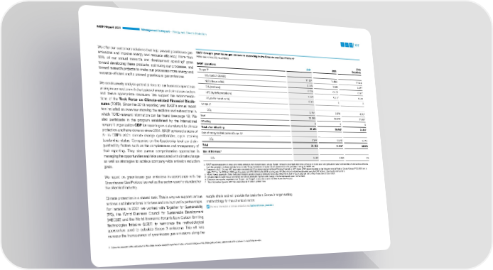 BASF Report 2021 Management’s Report – Energy and Climate Protection 127 We offer our customers solutions that help prevent greenhouse gas BASF Group’s greenhouse gas emissions according to the Greenhouse Gas Protocola Million metric tons CO equivalents emissions and improve energy and resource efficiency. More than 2 60% of our annual research and development spending1 goes 2018 BASF operations 2021 2020 (baseline) toward developing these products, optimizing our processes, and Scope 1b toward research projects to make our processes more energy and CO (carbon dioxide) 17.234 16.860 17.025 resource-efficient and to prevent greenhouse gas emissions. 2 N2O (nitrous oxide) 0.418 0.609 0.677 CH f We continuously analyze potential risks to our business operations 4 (methane) 0.034 0.023 0.027 arising in connection with the topics of energy and climate pr otection HFC (hydrofluorocarbons) 0.034 0.031f 0.091 and derive appropriate measures. We support the recommenda- SF6 (sulfur hexafluoride) 0.001 0 0 tions of the Task Force on Climate-related Financial Disclo- Scope 2c sures (TCFD). Since the 2019 reporting year, BASF’s annual report CO 2.464 3.279 4.067 has included an overview showing the sections and subsections in 2 f which TCFD-relevant information can be found (see page 19). We Total 20.185 20.802 21.887 also participate in the program established by the international Offsetting 0 0 0 nonprofit organization CDP for reporting on data relevant to climate f Total after offsetting 20.185 20.802 21.887 protection and have done so since 2004. BASF achieved a score of Sale of energy to third parties (Scope 1)d A– in CDP’s 2021 climate change questionnaire, again attaining f CO 0.947 0.845 0.773 Leadership status. Companies on the Leadership level are distin- 2 f guished by factors such as the completeness and transparency of Total 21.132 21.647 22.660 their reporting. They also pursue comprehensive approaches in Use of biomasse managing the opportunities and risks associated with climate change CO 0.091 0.024 n/a 2 as well as strategies to achieve company-wide emission reduction goals. a BASF reports separately on direct and indirect emissions from the purchase of energy. Scope 1 emissions encompass both direct emissions from production and generation of steam and electricity, as well as direct emissions from the generation of steam and electricity for sale. Scope 2 emissions comprise indirect emissions from the purchase of energy for BASF’s use. b Emissions of N O, CH and HFC have been translated into CO emissions using the Global Warming Potential, or GWP, factor. GWP factors are based on the Intergovernmental Panel on Climate Change (IPCC) 2007, errata 2 4 2 table 2012 for the 2018 and 2020 reporting years, and IPCC 2014 for the 2021 reporting year. HFC (hydrofluorocarbons) are calculated using the GWP factors of the individual components. c Market-based approach. Under the location-based approach, Scope 2 emissions were 3.362 million metric tons of CO in 2020 and 3.670 million metric tons of CO in 2021. We report on greenhouse gas emissions in accordance with the 2 2 d Includes sales to BASF Group companies; as a result, emissions reported under Scope 2 can be considered twice in some cases. Greenhouse Gas Protocol as well as the sector-specific standard for e Emissions are reported separately from Scope 1 and Scope 2 in accordance with the Greenhouse Gas Protocol. f The comparative figure for 2020 has been adjusted to reflect updated data. the chemical industry. Climate protection is a shared task. This is why we support various supply chain and will provide the basis for a Scope 3 target-setting national and international initiatives and are involved in partnerships. methodology for the chemical sector. For instance, in 2021 we worked with Together for Sustainability For more information on climate protection, see basf.com/climate_protection (TfS), the World Business Council for Sustainable Development (WBCSD) and the World Economic Forum’s Low-Carbon Emitting Technologies Initiative (LCET) to harmonize the methodological approaches used to calculate Scope 3 emissions. This will help increase the transparency of greenhouse gas emissions along the 1 Costs not relevant to the calculation of this share include research expenses in early innovation stages of the phase-gate process, patent costs and expenses for supporting services.