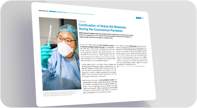 In Focus: Aid Measures During the Coronavirus Pandemic BASF Report 2021 Management’s Report – In Focus: Aid Measures During the Coronavirus Pandemic 108 In focus: Continuation of Global Aid Measures During the Coronavirus Pandemic BASF launched the Helping Hands aid campaign in 2020 to help fight the coronavirus and its effects. In 2021, we continued to use our expertise in research, production, procurement and logistics to support people affected by the pandemic around the world. In April 2021, BASF opened the first accredited corporate In 2021, BASF also provided in-kind support around the world to corona virus vaccination center in Germany at its Ludwigshafen overcome the challenges posed by the coronavirus pandemic. For site. More than 22,000 primary vaccinations and more than example, BASF donated molecular sieves to the Indian government 21,000 secondary vaccinations were administered there from to facilitate the production of medical oxygen. Medical equipment, April to August and more than 10,000 booster vaccinations were including ventilators, was also donated, and acute care units were administered there in December to BASF employees, contractors set up in Mumbai together with partners. We donated medical and site partners. The coronavirus vaccination center was estab- equipment to Malaysian hospitals for the treatment of COVID-19 lished and operated by an interdisciplinary team from various BASF patients. In South America, BASF launched a food drive and coordinated by Corporate Health Management. units, donated food packages to communities around BASF sites. The food was distributed there to those in need with the help of A global working group in our Pharma Solutions business unit employees who volunteered their time. has supported pharmaceutical companies in their research on vac- For more information on the Helping Hands aid campaign, see basf.com/en/helping-hands cines and therapies to combat COVID-19 since March 2020. The task force reviews patent applications, clinical trials and scientific publications to identify potential collaborations with companies. BASF is currently supporting the global development of more than 80 therapies with its ingredients and expertise. BASF products were used to cool coronavirus vaccines. For instance, Elastopir© insulation panels were produced in cooperation with a partner in Malaysia and used to equip refrigerated ware- houses in Asia. In cooperation with various partners in Germany, ® ® Neopor and Styropor , BASF’s expandable polystyrenes (EPS), Dr. Sung Min Pyo, a pharmacist in the Nutrition & Health division and part of BASF’s were used to produce boxes to transport COVID-19 vaccines due to interdisciplinary team at the coronavirus vaccination center, is responsible for their good insulating and shock-absorbing properties. ensuring that the v accines are used as required, among other things.