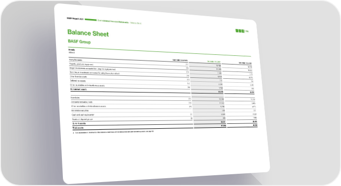 BASF Report 2021 Consoli dated Financial Statements – Balance Sheet 196 Balance Sheet BASF Group Assets Million € Explanations in Note December 31, 2021 December 31, 2020 Intangible assets [14] 13,499 13,145 Property, plant and equipment [15] 21,553 19,647 Integral investments accounted for using the equity method [10] 2,540 1,878 Non-integral investments accounted for using the equity method [10] 9,843 10,874 Other financial assets [10] 575 582 Deferred tax assets [12] 2,600 3,386 Other receivables and miscellaneous assets [18] 1,722 912 Noncurrent assets 52,332 50,424 Inventories [17] 13,868 10,010 Accounts receivable, trade [18] 11,942 9,466 Other receivables and miscellaneous assets [18] 5,568 4,673 Marketable securities 208 207 Cash and cash equivalentsa [1] 2,624 4,330 Assets of disposal groups [3] 840 1,182 Current assets 35,051 29,868 Total assets 87,383 80,292 a For a reconciliation of the amounts in the statement of cash flows with the balance sheet item cash and cash equivalents, see page 198