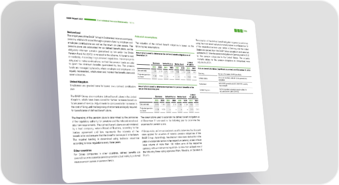 BASF Report 2021 Consoli dated Financial Statements – Notes 256 Switzerland Actuarial assumptions The valuation of the defined benefit obligation is generally performed The employees of the BASF Group in Switzerland receive a company using the most recent actuarial mortality tables as of December 31 pension, which is financed through a pension fund by employer and The valuation of the defined benefit obligation is based on the of the respective business year, which in Germany and the United employee contributions as well as the return on plan assets. The following key assumptions: States are derived from the BASF Group population and were last pension plans are accounted for as defined benefit plans, as the updated in 2019 for the pension obligations in Germany and in 2018 obligatory minimum pension guaranteed by law under the Swiss Assumptions used to determine the defined benefit obligation as of for the pension obligations in the United States. The actuarial Pension Fund Act (BVG) is included in the scheme. All benefits vest December 31 mortality tables for the pension obligations in Switzerland were immediately. According to government regulations, the employer is United adjusted in 2021. obligated to make contributions, so that the pension funds are able Germany United States Switzerland Kingdom to grant the minimum benefits guaranteed by law. The pension 2021 2020 2021 2020 2021 2020 2021 2020 Actuarial mortality tables (significant countries) as of December 31, 2021 funds are managed by boards, where employer and employees are Discount rate 1.10 0.70 2.70 2.30 0.40 0.10 2.00 1.50 Germany Heubeck Richttafeln 2018G (modified) equally represented, which steer and monitor the benefit plans and Projected pension asset allocation. increase 1.60 1.50 – – – – 3.50 3.10 United States RP-2018 (modified) with MP-2018 generational projection United Kingdom Switzerland BVG 2020 generational with CMI 2018 mortality improvement Employees are granted benefits based on a defined contribution Assumptions used to determine expenses for pension benefits in the S2PxA (standard actuarial mortality tables for plan. respective business year United Kingdom self-administered plans (SAPS)) United The BASF Group also maintains defined benefit plans in the United Germany United States Switzerland Kingdom Kingdom, which have been closed for further increases based on 2021 2020 2021 2020 2021 2020 2021 2020 future years of service. Adjustments to compensate for increases in Discount rate 0.70 1.10 2.30 3.10 0.10 0.20 1.50 2.20 the cost of living until the beginning of retirement are legally required Projected pension for beneficiaries of defined benefit plans. increase 1.50 1.50 – – – – 3.10 3.00 The financing of the pension plans is determined by the provisions The assumptions used to ascertain the defined benefit obligation as of the regulatory authority for pensions and the relevant social and of December 31 are used in the following year to determine the labor law requirements. The defined benefit plans are administered expenses for pension plans. by a trust company, whose Board of Trustees, according to the trustee agreement and law, represents the interests of the A Group-wide, uniform procedure is used to determine the discount beneficiaries and ensures that the benefits can be paid in the future. rates applied for valuation of material pension obligations of the The required funding is determined using technical valuations BASF Group. Accordingly, the discount rates were derived from the according to local regulations every three years. yields on corporate bonds in the respective currency zones with an issue volume of more than 100 million units of the respective Other countries currency with a minimum rating of AA– to AA+ from at least one of For Group companies in other countries, defined benefits are the following three rating agencies: Fitch, Moody’s, or Standard & covered in some cases by pension provisions, but mainly by external Poor’s. insurance companies or pension funds.