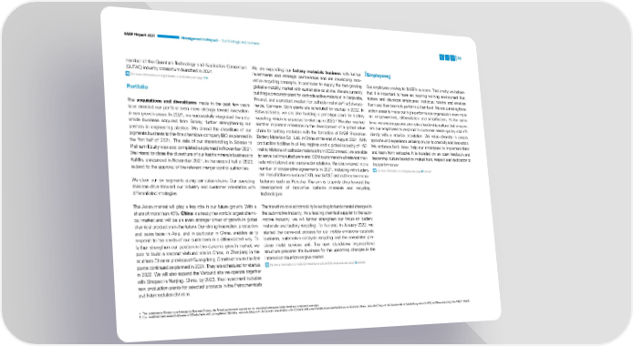 BASF Report 2021 Management’s Report – Our Strategic Action Areas 30 member of the Quantum Technology and Application Consortium We are expanding our battery materials business with further Employees (QUTAC) industry consortium launched in 2021. investments and strategic partnerships and are developing inno- For more information on digitalization in production, see page 119 vative recycling concepts, in particular to supply the fast-growing Our employees are key to BASF’s success. That is why we believe global e-mobility market with sustainable solutions. We are currently that it is important to have an inspiring working environment that 1 Portfolio building a precursor plant for cathode active materials in Harjavalta, fosters and develops employees’ individual talents and enables 2 Finland, and a production plant for cathode materials in Schwarz- them and their teams to perform at their best. We are pursuing three The acquisitions and divestitures made in the past few years heide, Germany. Both plants are scheduled for startup in 2022. In action areas to make our high-performance organization even more have oriented our portfolio even more strongly toward inno vation- Schwarzheide, we are also building a prototype plant for battery so: empowerment, differentiation and simplification. At the same 2 driven growth areas. In 2021, we successfully integrated the poly- recycling, which is expected to start up in 2023. We also reached time, we encourage and promote a leadership culture that empow- amide business acquired from Solvay, further strengthening our another important milestone in the development of a global value ers our employees to respond to customer needs quickly and effi- position in engineering plastics. We closed the divestiture of our chain for battery materials with the formation of BASF Shanshan ciently with a solution orientation. We value diversity in people, pigments business to the fine chemicals company DIC as planned in Battery Materials Co., Ltd. in China at the end of August 2021. With opinions and experience as being crucial to creativity and innovation. the first half of 2021. The sale of our shareholding in Solenis to production facilities in all key regions and a global capacity of 160 We embrace bold ideas, help our employees to implement them Platinum Equity was also completed as planned in November 2021. metric kilotons of cathode materials from 2022 onward, we are able and learn from setbacks. It is founded on an open feedback and We intend to close the divestiture of our kaolin minerals business to to serve cell manufacturers and OEM customers in all relevant mar- leadership culture based on mutual trust, respect and dedication to KaMin, announced in November 2021, in the second half of 2022, kets with tailored and sustainable solutions. We also entered into a top performance. subject to the approval of the relevant merger control authorities. number of cooperative agreements in 2021, including with battery For more information on employees, see page 97 onward cell manufacturers such as CATL and SVOLT and automotive manu- We steer our six segments along our value chains. Our operating facturers such as Porsche. The aim is to jointly drive forward the divisions drive forward our industry and customer orientation with development of innovative cathode materials and recycling differentiated strategies. technologies. The Asian market will play a key role in our future growth. With a The transition to electromobility is leading to fundamental changes in share of more than 45%, China is already the world’s largest chemi- the automotive industry. As a leading chemical supplier to the auto- cal market and will be an even stronger driver of growth in global motive industry, we will further strengthen our focus on battery chemical production in the future. Our strong innovation, production materials and battery recycling. To this end, in January 2022, we and sales base in Asia, and in particular in China, enables us to started the carve-out process for our mobile emissions catalysts respond to the needs of our customers in a differentiated way. To business, automotive catalysts recycling and the associated pre- further strengthen our position in this dynamic growth market, we cious metal services unit. The new, standalone organizational plan to build a second Verbund site in China, in Zhanjiang in the structure prepares the business for the upcoming changes in the southern Chinese province of Guangdong. Construction on the first internal combustion engine market. plants continued as planned in 2021. They are scheduled for startup For more information on material investments and portfolio measures, see page 38 onward in 2022. We will also expand the Verbund site we operate together with Sinopec in Nanjing, China, by 2023. This investment includes new production plants for selected products in the Petrochemicals and Intermediates divisions. 1 The investment in Finland is co-financed by Business Finland, the Finnish government organization for innovation funding and trade, travel and investment promotion. 2 Our investment and research activities in Schwarzheide and Ludwigshafen, Germany, receive funding from the German Federal Ministry for Economic Affairs and Climate Action and the Ministry for Economic Affairs, Labor and Energy of the German state of Brandenburg under the IPCEI on Batteries (funding code 16BZF101A/B).