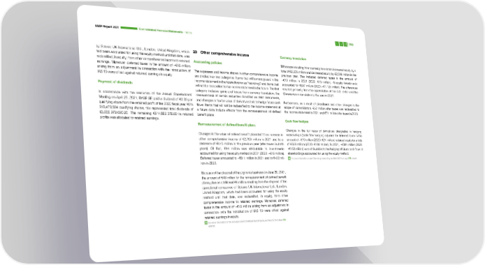 BASF Report 2021 Consoli dated Financial Statements – Notes 250 by Solenis UK International Ltd., London, United Kingdom, which 20 Other comprehensive income Currency translation had been accounted for using the equity method until that date, was reclassified, in equity, from other comprehensive income to retained Accounting policies Differences resulting from currency translation increased equity by a earnings. Moreover, deferred taxes in the amount of –€18 million total of €2,205 million and decreased equity by €2,598 million in the arising from an adjustment in connection with the introduction of The expenses and income shown in other comprehensive income previous year. This included deferred taxes in the amount of IAS 19 were offset against retained earnings in equity. are divided into two categories: Items that will be recognized in the –€19 million in 2021 (2020: €19 million). At-equity investments income statement in the future (known as “recycling”) and items that accounted for €697 million (2020: –€1,125 million). The differences Payment of dividends will not be reclassified to the income statement in the future. The first resulted primarily from the appreciation of the U.S. dollar and the category includes gains and losses from currency translation, the Chinese renminbi relative to the euro in 2021. In accordance with the resolution of the Annual Shareholders’ measurement of certain securities classified as debt instruments, Meeting on April 29, 2021, BASF SE paid a dividend of €3.30 per and changes in the fair value of derivatives held to hedge future cash Furthermore, as a result of divestitures and other changes in the qualifying share from the retained profit of the 2020 fiscal year. With flows. Items that will not be reclassified to the income statement at scope of consolidation, €52 million after taxes was reclassified to 918,478,694 qualifying shares, this represented total dividends of a future date include effects from the remeasurement of defined the income statement in 2021 and €71 million after taxes in 2020. €3,030,979,690.20. The remaining €914,882,378.80 in retained benefit plans. profits was allocated to retained earnings. Cash flow hedges Remeasurement of defined benefit plans Changes in the fair value of derivatives designated in hedging Changes in the value of defined benefit plans led to an increase in relationships (cash flow hedges) adjusted for deferred taxes in the other comprehensive income of €2,709 million in 2021 and to a amount of –€10 million (2020: €24 million) reduced equity by a total decrease of €973 million in the previous year (after taxes in both of €329 million (2020: €108 million). In 2021, –€381 million (2020: years). Of that, €44 million was attributable to investments –€163 million) was attributable to the hedging of future cash flows at accounted for using the equity method in 2021 (2020: –€19 million). shareholdings accounted for using the equity method. Deferred taxes amounted to –€811 million in 2021 and to €422 mil- For more information on cash flow hedge accounting, see Note 26.5 from page 274 onward lion in 2020. Because of the disposal of the pigments business on June 30, 2021, the amount of €48 million for the remeasurement of defined benefit plans, plus an additional €6 million resulting from the disposal of the operational companies of Solenis UK International Ltd., London, United Kingdom, which had been accounted for using the equity method until that date, was reclassified, in equity, from other comprehensive income to retained earnings. Moreover, deferred taxes in the amount of –€18 million arising from an adjustment in connection with the introduction of IAS 19 were offset against retained earnings in equity. For more information on the remeasurement of defined benefit plans, see Note 22 from page 254 onward