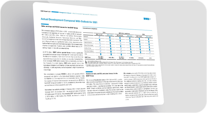 BASF Report 2021 Management’s Report – Actual Development Compared With Outlook for 2021 67 Actual Development Compared With Outlook for 2021 Sales, earnings and ROCE forecast for the BASF Group Forecast/actual comparison We increased sales to €78.6 billion in 2021, considerably above our Sales EBIT before special items ROCE forecast at the beginning of the year of sales growth to between 2021 forecast 2021 actual 2021 forecast 2021 actual 2021 forecast 2021 actual €61 billion and €64 billion. Sales in the Surface Technologies, Chemicals Chemi cals, Industrial Solutions, Agricultural Solutions and Nutri- Materials tion & Care segments rose more strongly than initially expected. This was driven primarily by significantly higher prices, especially in the Industrial Solutions Surface Technologies and Chemicals segments. We increased sales Surface Technologies volumes as expected. Currency and portfolio effects had an off- setting impact, in line with our assumptions. Nutrition & Care Agricultural Solutions At €7.8 billion, EBIT before special items likewise significantly Other – – exceeded the forecast range of between €4.1 billion and €5.0 billion. The Industrial Solutions, Nutrition & Care and Agricultural Solutions BASF Group €61 billion– €78.6 billion €4.1 billion– €7.8 billion 8.0%–9.2%a 13.5% €64 billiona €5.0 billiona segments in particular did not develop as expected. Industrial Solu- tions increased EBIT before special items considerably, contrary to At prior-year level: no change (+/–0.0%) | Slight increase/decrease: “slight” represents a change of 0.1%–5.0% for sales; 0.1%–10.0% for earnings; 0.1 to 1.0 percentage points for ROCE the forecast of a slight decline. EBIT before special items in the | Considerable increase/decrease: “considerable” represents a change of 5.1% or higher for sales; 10.1% or higher for earnings; more than 1.0 percentage points for ROCE Agricultural Solutions and Nutrition & Care segments declined con- a We updated our outlook in April, July and October 2021. We most recently updated it in October 2021, f orecasting sales of between €76 billion and €78 billion, EBIT before special items of between €7.5 billion and €8.0 billion, and a ROCE of between 13.2% and 14.1%. siderably; in both segments, we had expected a slight improvement in earnings. We considerably increased ROCE in almost all segments. ROCE Accelerator sales and CO emissions forecast for the CO emissions amounted to 20.2 million metric tons, slightly below 2 2 increased only slightly in the Agricultural Solutions segment, while BASF Group the range we forecast in February of between 20.5 million metric the Nutrition & Care segment saw a considerable decline. Overall, tons and 21.5 million metric tons. BASF significantly increased pro- the degree of improvement exceeded our expectations: ROCE for We increased Accelerator sales to €24.1 billion in 2021, consider- duction volumes in 2021 in response to stronger demand. To reduce the BASF Group amounted to 13.5%, considerably above the range ably above the range forecast in February of between €18 billion and the additional emissions resulting from this, we made procuring we had forecast of between 8.0% and 9.2%. €19 billion. The range forecast in October – between €21.5 billion energy from renewable sources a focus. To this end, BASF converted and €22.5 billion – was likewise exceeded. This was due to the energy supply agreements, acquired renewable energy certificates We revised the outlook provided in February 2021 in April, July and BASF Group’s extremely positive business performance, which and signed long-term supply agreements for green power. A project October 2021. In October 2021, we projected sales of between was also reflected in Accelerator sales. The decline caused by the to reduce nitrous oxide emissions in Ludwigshafen, Germany, was €76 billion and €78 billion. We expected EBIT before special items divestiture of the global pigments business and the resulting outflow successfully implemented. Divestitures such as the disposal of the of €7.5 billion to €8.0 billion. For ROCE, we forecast a range of of Accelerator products only had a slight offsetting effect overall. global pigments business led to a slight decline in emissions. In 13.2% to 14.1%. addition, emissions were significantly reduced by the lower capacity utilization of the ammonia plant due to the sharp rise in natural gas prices.