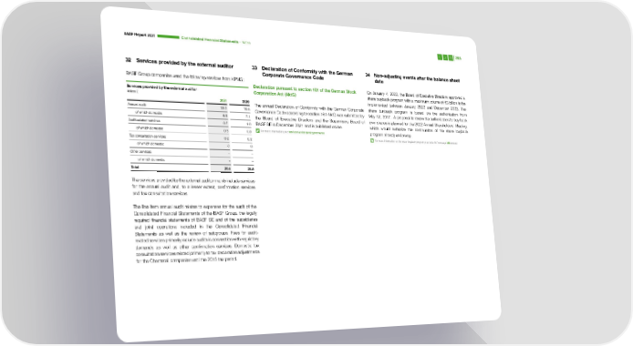 BASF Report 2021 Consoli dated Financial Statements – Notes 285 32 Services provided by the external auditor 33 Declaration of Conformity with the German 34 Non-adjusting events after the balance sheet Corporate Governance Code date BASF Group companies used the following services from KPMG: Declaration pursuant to section 161 of the German Stock On January 4, 2022, the Board of Executive Directors approved a Services provided by the external auditor Corporation Act (AktG) share buyback program with a maximum volume of €3 billion to be Million € implemented between January 2022 and December 2023. The 2021 2020 The annual Declaration of Conformity with the German Corporate share buyback program is based on the authorization from Annual audit 19.2 19.6 Governance Code according to section 161 AktG was submitted by May 12, 2017. A proposal to renew the authorization to buy back of which domestic 6.8 7.1 the Board of Executive Directors and the Supervisory Board of own shares is planned for the 2022 Annual Shareholders’ Meeting, Audit-related services 0.7 1.0 BASF SE in December 2021 and is published online. which would authorize the continuation of the share buyback of which domestic 0.5 0.8 For more information, see basf.com/en/corporategovernance program already underway. Tax consultation services 0.2 0.2 For more information on the share buyback program, see Note 19 from page 249 onward of which domestic 0 0 Other services – – of which domestic – – Total 20.1 20.8 The services provided by the external auditor mainly include services for the annual audit and, to a lesser extent, confirmation services and tax consultation services. The line item annual audit relates to expenses for the audit of the Consolidated Financial Statements of the BASF Group, the legally required financial statements of BASF SE and of the subsidiaries and joint operations included in the Consolidated Financial Statements as well as the review of subgroups. Fees for audit- related services primarily include audits in connection with r egulatory demands as well as other confirmation services. Domestic tax consultation services related primarily to tax declaration adjustments for the Chemetall companies until the 2015 tax period.