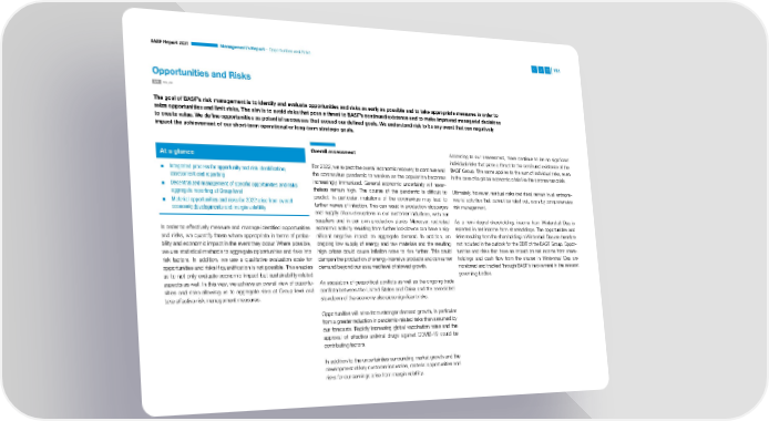 BASF Report 2021 Management’s Report – Opportunities and Risks 151 Opportunities and Risks GRI 102, 201 The goal of BASF’s risk management is to identify and evaluate opportunities and risks as early as possible and to take appropriate measures in order to seize opportunities and limit risks. The aim is to avoid risks that pose a threat to BASF’s continued existence and to make improved managerial decisions to create value. We define opportunities as potential successes that exceed our defined goals. We understand risk to be any event that can negatively impact the achievement of our short-term operational or long-term strategic goals. At a glance Overall assessment According to our assessment, there continue to be no significant individual risks that pose a threat to the continued existence of the ▪ Integrated process for opportunity and risk identification, For 2022, we expect the overall economic recovery to continue and BASF Group. The same applies to the sum of individual risks, even assessment and reporting the coronavirus pandemic to weaken as the population becomes in the case of a global economic crisis like the coronavirus crisis. ▪ Decentralized management of specific opportunities and risks: increasingly immunized. General economic uncertainty will never- aggregate reporting at Group level thel ess remain high. The course of the pandemic is difficult to Ultimately, however, residual risks (net risks) remain in all entrepre- ▪ Material opportunities and risks for 2022 arise from overall predict; in particular, mutations of the coronavirus may lead to neurial activities that cannot be ruled out, even by comprehensive economic developments and margin volatility further waves of infection. This can result in production stoppages risk management. and supply chain disruptions in our customer industries, with our suppliers and in our own production plants. Moreover, restricted As a non-integral shareholding, income from Wintershall Dea is In order to effectively measure and manage identified opportunities economic activity resulting from further lockdowns can have a sig- reported in net income from shareholdings. The opportunities and and risks, we quantify these where appropriate in terms of proba- nificant negative impact on aggregate demand. In addition, an risks resulting from the shareholding in Wintershall Dea are therefore bility and economic impact in the event they occur. Where possible, ongoing low supply of energy and raw materials and the resulting not included in the outlook for the EBIT of the BASF Group. Oppor- we use statistical methods to aggregate opportunities and risks into high prices could cause inflation rates to rise further. This could tunities and risks that have an impact on net income from share- risk factors. In addition, we use a qualitative evaluation scale for dampen the production of energy-intensive products and consumer holdings and cash flow from the shares in Wintershall Dea are opportunities and risks if quantification is not possible. This enables demand beyond our assumed level of slowed growth. monitored and tracked through BASF’s involvement in the relevant us to not only evaluate economic impact but sustainability-related govern ing bodies. aspects as well. In this way, we achieve an overall view of opportu- An escalation of geopolitical conflicts as well as the ongoing trade nities and risks allowing us to aggregate risks at Group level and conflicts between the United States and China and the associated take effective risk management measures. slowdown of the economy also pose significant risks. Opportunities will arise from stronger demand growth, in particular from a greater reduction in pandemic-related risks than assumed by our forecasts. Rapidly increasing global vaccination rates and the approval of effective antiviral drugs against COVID-19 could be contributing factors. In addition to the uncertainties surrounding market growth and the development of key customer industries, material opportunities and risks for our earnings arise from margin volatility.