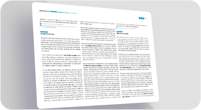BASF Report 2021 Management’s Report – Raw Materials 115 initiatives, for example, in Morocco for our argan-based products, subject matter is the assessment of a joint investment in a pyrolysis metals from scrap of cell manufacturers and battery material pro- and in India for our active ingredients based on the moringa tree. plant for plastic waste. ducers that do not meet product specifications. For more information on biodiversity, see page 138 onward For more information on the circular economy, see page 44 For more information on our voluntary commitment to palm oil products and the Palm Progress We have also made further progress with the chemical recycling of Report, see basf.com/en/palm-dialog used mattresses made of flexible polyurethane. It is based on a wet chemical process developed by BASF. After initial successful trials, Mineral raw materials our teams continued developing the process in 2021. Precursors Recycled feedstocks recovered from old mattresses can now be used to produce new We procure a number of mineral raw materials, which we use to mattress-sized blocks of flexible polyurethane foam. The new pro- produce automotive and process catalysts or battery materials, Recycling is becoming increasingly important due to limited resources, cess is currently being optimized and tested on a larger scale. among other products. We are continually improving our products growing sustainability requirements in the markets and regulatory and processes to minimize the use of primary mineral raw materials. developments. We want to increase the use of recycled feedstocks We have many years of experience and a high degree of specializa- At the same time, we are driving forward the recycling of mineral raw with our Circular Economy Program: From 2025 onward, we aim to tion in recycling precious metals such as platinum, palladium materials, for example, by recovering platinum metals from auto- process around 250,000 metric tons of recycled and waste-based and rhodium. They are used in automotive catalysts as well as in motive and process catalysts and using these as secondary raw materials every year worldwide, replacing fossil raw materials process and chemical catalysts. We primarily use the precious resources (see “Recycled feedstocks”). (see page 44). metals recovered in this way as feedstocks in catalyst production. With the expansion of our refinery plant in Seneca, South Carolina, Sourcing mineral raw materials responsibly is important to BASF. We A focal point of our activities here is chemically recycling plastic and the acquisition of assets from Zodiac Enterprises in Caldwell, implemented measures to meet the requirements of the E.U. Conflict waste. This technology complements mechanical recycling and can Texas, we are further expanding our leading position in platinum Minerals Regulation by the January 1, 2021 deadline. This defines help to reduce the amount of plastic waste that is disposed of in group metal recycling. supply chain due diligence for tin, tantalum, tungsten, their ores and landfill or thermally recovered. Chemical recycling breaks down gold (3TG) imported into the E.U. from conflict-affected and high- plastics into their building blocks or converts them into basic chemi- The growing demand for electromobility is also increasing the need risk areas (CAHRAs). To supplement our Supplier Code of Conduct cals. Different methods are used to achieve this. for lithium-ion battery recycling. As a leading producer of battery (see page 109), we introduced a Group-wide Supply Chain Policy materials with future local production capacities in the three main for Conflict Minerals in 2021. It contains expectations for our TM project, our technology partners use the In our ChemCycling markets – Asia, Europe and North America – BASF has in-depth suppliers from CAHRAs and outlines voluntary commitments. pyrolysis process to extract pyrolysis oil from mixed plastic waste or expertise in battery chemistry and process technology. We are used tires, which were not previously recycled. We can feed this utilizing these competencies to address battery recycling as an In addition to responsible procurement of the 3TG minerals, BASF is pyrolysis oil into our Verbund as an alternative to fossil raw materials additional growth market in cooperation with partners along the committed to responsible and sustainable global supply chains for and use it to make new products. These have exactly the same value chain (see page 30). In this way, we want to ensure that valu- other mineral raw materials as well. These include cobalt, a key properties as products manufactured from fossil feedstocks. We able metals remain in the production cycle for as long as possible. component in the production of battery materials for electric vehi- use a certified mass balance approach to allocate the percentage This conserves resources while enabling production of cathode cles, among other applications. Our cobalt supply chain is organized of recycled content to the end product (see page 113). In 2021, active materials in Europe with a significantly lower carbon footprint according to special sustainability criteria. Our goal is to not purchase TM we were able to further expand our portfolio of these Ccycled compared with the industrial standard. At the Schwarzheide site in cobalt from artisanal mines and to exclude this in supply chains as products. It now comprises around 50 products that our customers Germany, where a cathode active materials plant is already under long as responsible artisanal production cannot be verified. use, for example to manufacture transport cases for medicine, construction, we will also build a prototype plant for battery recycling high-performance plastics for the automotive industry, packaging by 2023. The prototype plant will allow for the development of new Together with BMW, Samsung SDI, Samsung Electronics, Volks- materials and functional textiles. We also signed a 