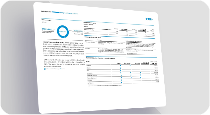 BASF Report 2021 Management’s Report – Materials 78 r Materials – sales Division sales by region By division (Location of customer) Divisions South America, Total Europe North America Asia Pacific Africa, Middle East (million €) Performance Materials 36% 20% 39% 5% 7,292 €7,292 million €7,922 million Monomers 47% 19% 29% 5% 7,922 Performance Materials €15,214 million Monomers Share of sales: 48% Share of sales: 52% Division, products, applications Products Customer industries and applications Performance Materials Engineering plastics, biodegradable plastics, foam specialties, Automotive manufacture, electrical engineering, packaging, games, sports Income from operations (EBIT) before special items rose by polyurethanes and leisure, household, mechanical engineering, construction, agriculture, €1,583 million compared with 2020 to €2,418 million. Both divi- medical technology, sanitation and water industry, solar thermal energy and photovoltaics sions considerably increased EBIT before special items. Earnings Monomers Isocyanates (MDI, TDI), ammonia, caprolactam, adipic acid, Industries such as plastics, woodworking, furniture, packaging, textile, growth in the Monomers division was primarily due to higher mar- chlorine, urea, glues and impregnating resins, caustic soda, construction and automotive gins in isocyanates and polyamides. In the Performance Materials polyamides 6 and 6.6, standard alcoholates, sulfuric and nitric acid Use in the BASF Verbund division, EBIT before special items was above the prior-year level, mainly driven by positive volume development. Production capacities of selected products in the regionsa EBIT rose by €2,454 million year on year to €2,345 million. Special Annual capacity items amounted to –€73 million in 2021, after –€944 million in Product South America, Europe North America Asia Pacific Africa, Middle East (metric tons) 2020. The special charges in the previous year were primarily attributable to impairments. Ammonia • • 1,765,000 For the outlook for 2022, see page 148 onward Chlorine • 595,000 Urea • 545,000 Isocyanates • • • 2,620,000 Polyamides 6 and 6.6 • • • 925,000 Polyamide precursors • • • 1,420,000 Propylene • 675,000 Sulfuric acid • 920,000 a All capacities are included at 100%, including plants belonging to joint operations and joint ventures.