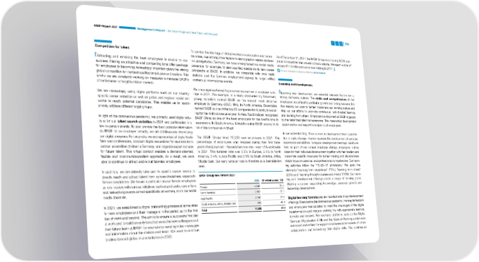 BASF Report 2021 Management’s Report – We Value People and Treat Them with Respect 100 Competition for talent To combat the shortage of skilled workers in production and techni- As of December 31, 2021, the BASF Group was training 3,028 peo- cal areas, due among other factors to demographic-related declines ple in 12 countries and around 50 occupations. We spent a total of Attracting and retaining the best employees is crucial to our in Ludwigshafen, Germany, we have strengthened our social media around €119 million on vocational training in 2021. success. Having an attractive and compelling total offer package presence, for example, to alert qualified specialists to new career For more information on careers at BASF, see basf.com/careers for employees is becoming increasingly important given the strong prospects at BASF. In addition, we cooperate with local radio global competition for the best qualified employees and leaders. This stations and the German employment agency to target skilled is why we are constantly working on measures to increase BASF’s workers at informational events. Learning and development attractiveness in the global labor markets. We once again achieved high scores in a number of employer rank- Learning and development are essential success factors for a We are increasingly using digital platforms such as our country- ings in 2021. For example, in a study conducted by Universum, strong company culture. The skills and competencies of our specific career websites as well as global and regional social net- young scientists ranked BASF as the second most attractive employees are critical for profitable growth and lasting success. For works to reach potential candidates. This enables us to appro- employer in Germany (2020: fifth). In North America, DiversityInc this reason, we want to further modernize our learning culture and priately address different target groups. named BASF as one of the top 50 companies for diversity in recruit- step up our efforts to promote continuous, self-directed learning ing for the ninth consecutive year. In Asia, Top Employer recognized and learning from others. Employee development at BASF is guided In light of the coronavirus pandemic, we primarily used digital solu- BASF China as one of the best employers for the twelfth time in by the belief that talent is in everyone. This means that development tions for our talent search activities in 2021 and participated in a succession. In South America, LinkedIn ranked BASF second in its opportunities and support are open to all employees. few in-person events. To also provide the best possible information list of top companies in Brazil. on BASF as an employer virtually, we are continuously developing In our understanding, there is more to development than a promo- our digital presence. For example, we are represented at digital trade The BASF Group hired 10,293 new employees in 2021. The tion or a job change – it encompasses the development of personal fairs and conferences, conduct digital excursions for students from percentage of employees who resigned during their first three experience and abilities. In regular development meetings, which are various universities of sites in Germany, and organize expert lectures years of employment – the early turnover rate – was 1.5% worldwide held as part of our annual employee dialogs, employees outline for future talent. This virtual contact enables a demand-oriented, in 2021. This turnover rate was 0.6% in Europe, 2.4% in North ideas for their individual development together with their leaders and flexible and location-independent approach. As a result, we were America, 3.4% in Asia Pacific and 2.5% in South America, Africa, determine specific measures for further training and development, able to continue to attract and recruit talented employees. Middle East. Our early turnover rate is therefore at a desirable low which focus on personal and professional competencies. Our learn- level. ing activities follow the “70-20-10” philosophy: We apply the In addition, we consistently take part in specific career events to elements “learning from experience” (70%), “learning from others” directly reach and attract talent from various disciplines, especially BASF Group new hires in 2021 (20%) and “learning through courses and media” (10%). Our learn- female candidates. We focus in particular on our female employees 2021 Of which women (%) ing and development offerings cover a range of learning goals: as role models with various initiatives such as podcasts, career fairs Europe 4,045 30.4 Starting a career, expanding knowledge, personal growth and and networking events aimed specifically at women, or on our social North America 2,551 29.3 leadership development. media channels. Asia Pacific 2,797 31.0 Digital learning formats play an important role in our development In 2021, we established a digital onboarding process at some sites South America, Africa, Middle East 900 48.4 offerings. Even before the coronavirus pandemic, training for leaders for new employees and their managers in the period up to the first Total 10,293 31.9 and employees was updated to meet the challenges of the digital day of work and beyond. The aim is to ensure a successful first day transformation and modern working life with appropriate learning at work and to build an early bond between the new colleagues and formats and content. For example, platforms such as the Digital their future team at BASF, for example by sending video messages Campus, Digitalization & Me and the Ways of Working portal were and information about the division and team. We want to continue enhanced and refined to support employees in all aspects of virtual to drive forward global implementation in 2022. collaboration and in building their digital skills. The continuous