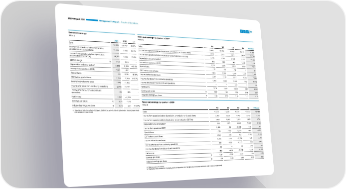 BASF Report 2021 Management’s Report – Results of Operations 60 Sales and earnings Sales and earnings by quarter in 2021a Million € Million € 2021 2020 +/– Q1 Q2 Q3 Q4 Full year Sales 78,598 59,149 32.9% Sales 19,400 19,753 19,669 19,776 78,598 Income from operations before depreciation, 11,348 7,435 52.6% Income from operations before depreciation, amortization and special items 3,181 3,217 2,771 2,179 11,348 amortization and special items Income from operations before depreciation and amortization (EBITDA) 3,176 3,199 2,729 2,250 11,355 Income from operations before depreciation 11,355 6,494 74.9% and amortization (EBITDA) Depreciation and amortizationb 865 883 907 1,023 3,678 EBITDA margin % 14.4 11.0 − Income from operations (EBIT) 2,311 2,316 1,822 1,227 7,677 Depreciation and amortizationa 3,678 6,685 –45.0% Special items −10 −39 −43 1 −91 Income from operations (EBIT) 7,677 –191 . EBIT before special items 2,321 2,355 1,865 1,227 7,768 Special items –91 –3,751 97.6% Income before income taxes 2,247 2,189 1,777 1,235 7,448 EBIT before special items 7,768 3,560 118.2% Income after taxes from continuing operations 1,810 1,794 1,424 990 6,018 Income before income taxes 7,448 –1,562 . Income after taxes from discontinued operations − − −43 7 −36 Income after taxes from continuing operations 6,018 –1,471 . Net income 1,718 1,654 1,253 898 5,523 Income after taxes from discontinued –36 396 . Earnings per share € 1.87 1.80 1.36 0.98 6.01 operations Adjusted earnings per share € 2.00 2.03 1.56 1.17 6.76 Net income 5,523 –1,060 . Earnings per share € 6.01 −1.15 . Sales and earnings by quarter in 2020a Adjusted earnings per share € 6.76 3.21 110.6% Million € Q1 Q2 Q3 Q4 Full year a Depreciation and amortization of property, plant and equipment and intangible assets (including impairments Sales 16,753 12,680 13,811 15,905 59,149 and reversals of impairments) Income from operations before depreciation, amortization and special items 2,579 1,229 1,542 2,085 7,435 Income from operations before depreciation and amortization (EBITDA) 2,428 1,070 1,044 1,952 6,494 Depreciation and amortizationb 972 1,011 3,682 1,020 6,685 Income from operations (EBIT) 1,456 59 −2,638 932 −191 Special items −184 −167 −3,219 −181 −3,751 EBIT before special items 1,640 226 581 1,113 3,560 Income before income taxes 1,200 −923 −2,786 947 −1,562 Income after taxes from continuing operations 881 −888 −2,177 713 −1,471 Income after taxes from discontinued operations 22 14 13 347 396 Net income 885 −878 −2,122 1,055 −1,060 Earnings per share € 0.97 −0.96 −2.31 1.15 −1.15 Adjusted earnings per share € 1.26 0.25 0.60 1.10 3.21 a Quarterly results not audited b Depreciation and amortization of property, plant and equipment and intangible assets (including impairments and reversals of impairments)
