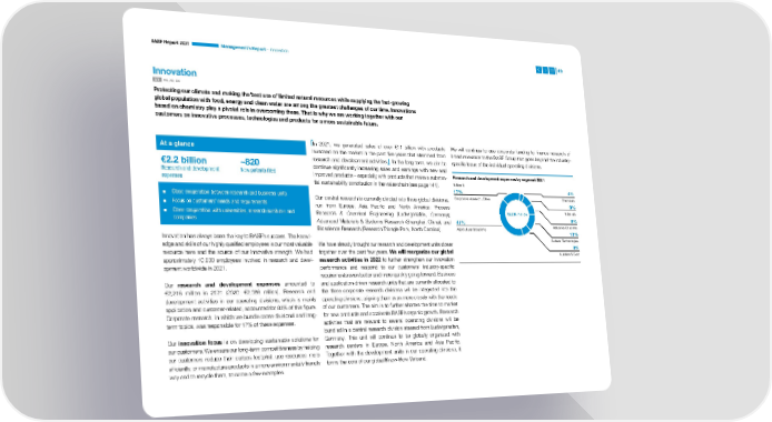 BASF Report 2021 Management’s Report – Innovation 49 Innovation GRI 102, 302, 305 Protecting our climate and making the best use of limited natural resources while supplying the fast-growing global population with food, energy and clean water are among the greatest challenges of our time. Innovations based on chemistry play a pivotal role in overcoming these. That is why we are working together with our customers on innovative processes, technologies and products for a more sustainable future. At a glance In 2021, we generated sales of over €11 billion with products We will continue to use corporate funding to finance research of launched on the market in the past five years that stemmed from broad relevance to the BASF Group that goes beyond the industry- €2.2 billion ~820 research and development activities. In the long term, we aim to specific focus of the individual operating divisions. continue significantly increasing sales and earnings with new and Research and development New patents filed improved products – especially with products that make a substan- Research and development expenses by segment 2021 expenses tial sustainability contribution in the value chain (see page 141). Million € 17% 4% ▪ Close cooperation between research and business units Our central research is currently divided into three global divisions, Corporate research, Other Chemicals ▪ Focus on customers’ needs and requirements run from Europe, Asia Pacific and North America: Process 9% ▪ Close cooperation with universities, research institutes and Research & Chemical Engineering (Ludwigshafen, Germany); €2,216 million Materials companies Advanced Materials & Systems Research (Shanghai, China); and 41% 8% Bioscience Research (Research Triangle Park, North Carolina). Agricultural Solutions Industrial Solutions Innovation has always been the key to BASF’s success. The knowl- 13% edge and skills of our highly qualified employees is our most valuable We have already brought our research and development units closer Surface Technologies resource here and the source of our innovative strength. We had together over the past few years. We will reorganize our global 8% Nutrition & Care approximately 10,000 employees involved in research and devel- research activities in 2022 to further strengthen our innovation opment worldwide in 2021. performance and respond to our customers’ industry-specific requirements even better and more quickly going forward. Business Our research and development expenses amounted to and application-driven research units that are currently allocated to €2,216 mil lion in 2021 (2020: €2,086 million). Research and the three corporate research divisions will be integrated into the development activities in our operating divisions, which is mainly operating divisions, aligning them even more closely with the needs application and customer-related, accounted for 83% of this figure. of our customers. The aim is to further shorten the time to market Corporate research, in which we bundle cross-divisional and long- for new products and accelerate BASF’s organic growth. Research term topics, was responsible for 17% of these expenses. activities that are relevant to several operating divisions will be bundled in a central research division steered from Ludwigshafen, Our innovation focus is on developing sustainable solutions for Germany. This unit will continue to be globally organized with our customers. We ensure our long-term competitiveness by helping research centers in Europe, North America and Asia Pacific. our customers reduce their carbon footprint, use resources more Together with the development units in our operating divisions, it efficiently, or manufacture products in a more environmentally friendly forms the core of our global Know-How Verbund. way and to recycle them, to name a few examples.