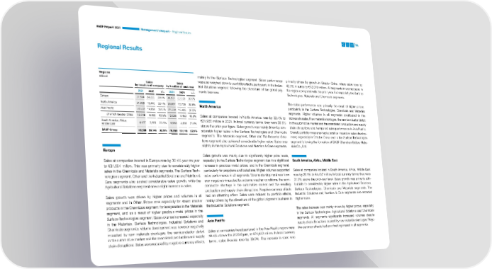 BASF Report 2021 Management’s Report – Regional Results 94 Regional Results Regions mainly in the Surface Technologies segment. Sales performance primarily driven by growth in Greater China, where sales rose by Million € was also weighed down by portfolio effects, particularly in the Indus- 42.5% in euros to €12,018 million. All segments improved sales in Sales Sales trial Solutions segment following the divestiture of the global pig- the region compared with the prior year, but especially the Surface by location of company by location of customer 2021 2020 +/– 2021 2020 +/– ments business. Technologies, Materials and Chemicals segments. Europe 31,594 24,223 30.4% 30,531 23,129 32.0% The sales performance was primarily the result of higher prices, North America 21,935 16,440 33.4% 20,867 15,709 32.8% North America particularly in the Surface Technologies, Chemicals and Materials Asia Pacific 20,632 14,895 38.5% 21,234 15,406 37.8% segments. Higher volumes in all segments contributed to the of which Greater China 12,018 8,433 42.5% 12,036 8,463 42.2% Sales at companies located in North America rose by 33.4% to increase in sales. Raw material shortages, the semiconductor deficit South America, Africa, €21,935 million in 2021. In local currency terms, they were 38.5% in the automotive market and the associated production and supply Middle East 4,437 3,591 23.5% 5,965 4,905 21.6% above the prior-year figure. Sales growth was mainly driven by con- chain disruptions also hampered sales performance in Asia Pacific. BASF Group 78,598 59,149 32.9% 78,598 59,149 32.9% siderably higher sales in the Surface Technologies and Chemicals Overall, portfolio measures had a positive impact on sales develop- segments. The Materials segment, Other and the Industrial Solu- ment, especially in Greater China and in the Surface Technologies tions segment also achieved considerably higher sales. Sales rose segment following the formation of BASF Shanshan Battery Mate- slightly in the Agricultural Solutions and Nutrition & Care segments. rials Co., Ltd. Europe Sales growth was mainly due to significantly higher price levels, Sales at companies located in Europe rose by 30.4% year on year especially in the Surface Technologies segment due to a significant South America, Africa, Middle East to €31,594 million. This was primarily due to considerably higher increase in precious metal prices, and in the Chemicals segment, sales in the Chemicals and Materials segments. The Surface Tech- particularly for propylene and butadiene. Higher volumes supported Sales at companies located in South America, Africa, Middle East nologies segment, Other and the Industrial Solutions and Nutrition & sales performance in all segments. Volume development was how- rose by 23.5% to €4,437 million. In local currency terms, they were Care segments also posted considerable sales growth, while the ever negatively impacted by extreme weather conditions, the semi- 31.0% above the prior-year level. Sales growth was primarily attri- Agricultural Solutions segment saw a slight increase in sales. conductor shortage in the automotive market and the resulting but able to considerably higher sales in the Agricultural Solutions, production and supply chain disruptions. Negative currency effects Surface Technologies, Chemicals and Materials segments. The Sales growth was driven by higher prices and volumes in all had an offsetting effect. Sales were reduced by portfolio effects, Indus trial Solutions and Nutrition & Care segments also recorded segments and in Other. Prices rose especially for steam cracker mainly driven by the divestiture of the global pigments business in higher sales. products in the Chemicals segment, for isocyanates in the Materials the Industrial Solutions segment. segment, and as a result of higher precious metal prices in the The sales increase was mainly driven by higher prices, especially Surface Technologies segment. Sales volumes increased, especially in the Surface Technologies, Agricultural Solutions and Chemicals in the Materials, Surface Technologies, Industrial Solutions and Asia Pacific segments. All segments significantly increased volumes despite Chemi cals segments. Volume development was however negatively supply chain disruptions caused by raw materials shortages. Nega- impacted by raw materials shortages, the semiconductor deficit Sales at companies headquartered in the Asia Pacific region were tive currency effects had an offsetting impact in all segments. in the automotive market and the associated production and supply 38.5% above the 2020 figure, at €20,632 million. In local currency chain disruptions. Sales were reduced by negative currency effects, terms, sales likewise rose by 38.5%. The increase in sales was