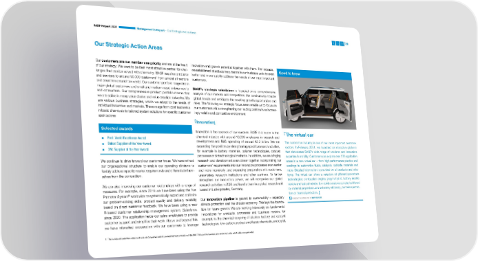 BASF Report 2021 Management’s Report – Our Strategic Action Areas 28 Our Strategic Action Areas Our customers are our number one priority and are at the heart innovation and growth potential together with them. For instance, Good to know of our strategy. We want to be their most attractive partner for chal- we established interdisciplinary teams in our business units to even lenges that can be solved with chemistry. BASF supplies products better and more quickly address the needs of our most important and services to around 90,000 customers1 from almost all sectors customers. and countries around the world. Our customer portfolio ranges from major global customers and small and medium-sized enterprises to BASF’s strategic orientation is founded on a comprehensive end consumers. Our comprehensive product portfolio means that analysis of our markets and competitors. We continuously monitor we are active in many value chains and value creation networks. We global trends and anticipate the resulting growth opportunities and use various business strategies, which we adapt to the needs of risks. The following six strategic focus areas enable us to focus on individual industries and markets. These range from cost leadership our customers while strengthening our leading position in an increas- in basic chemicals to tailored system solutions for specific customer ingly volatile and competitive environment. applications. Innovation Selected awards Innovation is the bedrock of our success. BASF is a leader in the chemical industry with around 10,000 employ ees in research and The virtual car ▪ Ford: World Excellence Award development and R&D spending of around €2.2 billion. We are ▪ Dulux: Supplier of the Year Award The automotive industry is one of our most important customer expand ing this position by strengthening specific research activities, sectors. In February 2021, we launched an interactive platform ▪ 3M: Supplier of the Year Award for example in battery materials, polymer technologies, catalyst that showcases BASF’s wide range of solutions and innovation processes or biotechnological methods. In addition, we are bringing expertise in mobility: Customers can explore over 500 application We continue to drive forward our customer focus. We have refined research and development even closer together, incorporating our areas in a new virtual car – from high-performance plastics and our organizational structure to enable our operating divisions to customers’ requirements into our innovation processes even earlier coatings to automotive fluids, catalysts, cathode materials and flexibly address specific market requirements and differentiate them- and more intensively, and expanding cooperation with customers, more. Detailed information is provided on all products and solu- selves from the competition. universities, research institutions and other partners. To further tions. The virtual car offers a selection of different powertrain strengthen our innovation power, we will reorganize our global technologies: combustion engine, plug-in hybrid, battery electric We are also improving our customer relationships with a range of research activities in 2022 and bundle them in a global research unit vehicle and fuel cell vehicle. E-mobility solutions can also be filtered measures. For example, since 2019 we have been using the Net based in Ludwigshafen, Germany. by material properties such as battery efficiency, corrosion protec- Promoter System® worldwide to systematically record and optimize tion or thermal protection. our problem-solving skills, product quality and delivery reliability Our innovation pipeline is geared to sustainability – especially Discover the virtual car at basf-vcar.com based on direct customer feedback. We have been using a new climate protection and the circular economy. This lays the founda- IT-based customer relationship management system, Salesforce, tion for future growth: We are working intensively on fundamental since 2020. The application helps our sales employees to provide innovations for products, processes and business models, for customer support and simplifies their work. Above and beyond this, example in the chemical recycling of plastics, battery and catalyst we have intensified cooperation with our customers to leverage technologies, low-carbon production of basic chemicals, and digital, 1 The number of customers refers to all external companies (sold-to parties) that had contracts with the BASF Group in the business year concerned under which sales were generated.