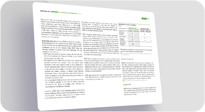 BASF Report 2021 Consoli dated Financial Statements – Notes 267 December 31, 2021, financial liabilities related to contracts yet to be By holding commodity derivatives and precious metal trading Exposure due to commodity derivatives adjusted were identified in the amount of €302 million. These are positions, BASF is exposed to price risks. The valuation of Million € mainly variable-rate bank loans referenced to a USD LIBOR commodity derivatives and precious metal trading positions at fair December 31, 2021 December 31, 2020 (€187 million) or EONIA (€115 million). Furthermore, financial assets value means that adverse changes in market prices could negatively Exposure Value at risk Exposure Value at risk related to contracts yet to be adjusted were identified in the amount affect the earnings and equity of BASF. Crude oil, oil of €85 million. These are mainly short-term loans, particularly to products and 97 18 56 5 natural gas nonconsolidated subsidiaries, that are referenced to a USD LIBOR BASF concluded several physical power purchase agreements Precious metals 51 1 88 1 (€85 million). No derivatives were identified that are associated with (physical PPAs) in Europe with terms of up to 25 years in 2021. contracts yet to be adjusted. Under the physical PPAs, BASF procures electricity and associated Agricultural 58 0 37 0 commodities green electricity certificates, known as guarantees of origin (GoOs), Electricity and Commodity price risks: Some of BASF’s divisions are exposed to at a fixed price. Some physical PPAs are not eligible for the own use green electricity 388 7 – – strong fluctuations in raw materials prices. These result primarily exemption and are therefore recognized as derivatives in the bal- certificates from raw materials (for example naphtha, benzene, natural gas, LPG ance sheet. In addition, BASF concluded what is known as a virtual condensate) as well as from precious metals. BASF takes the power purchase agreement (virtual PPA) with a term of 15 years in The exposure corresponds to the net amount of all long and short following measures to reduce price risks associated with the the United States in 2021. The virtual PPA contains an embedded positions of the respective commodity category. purchase of raw materials: contract for difference for electricity that is recognized separately as For more information on BASF’s financial risks and risk management, see Opportunities and Risks – BASF uses commodity derivatives to hedge risks from the vola- a derivative in the balance sheet. from page 151 onward tility of raw materials prices. These are primarily options on crude oil, oil products and natural gas. BASF performs value-at-risk analyses for all commodity derivatives Default and credit risk – The Catalysts division enters into both short-term and long-term and precious metal trading positions. Using the value-at-risk analysis purchase contracts with precious metal and battery metal enables continual quantification of market risk and forecasting of the Default and credit risks arise when customers and debtors do not producers. It also buys precious metals on spot markets from maximum possible loss within a given confidence interval over a fulfill their contractual obligations. BASF regularly analyzes the various business partners. The price risk from metals purchased defined period. The value-at-risk calculation is based on a confidence creditworthiness of the counterparties and grants credit limits on the to be sold on to third parties, or for use in the production of interval of 95% and a holding period of one day. BASF uses the basis of this analysis. Due to the global activities and diversified catalysts and battery materials, is hedged using derivative variance-covariance approach. customer structure of the BASF Group, there is no significant instruments. This is mainly performed using forward contracts, concentration of default risk. The carrying amount of all receivables, which are settled by either entering into offsetting contracts or by BASF uses value at risk in conjunction with other risk management loans and interest-bearing securities plus the nominal value of delivering the precious metal. tools. Besides value at risk, BASF sets volume-based limits as well financial obligations stemming from contingent liabilities not to be – In the Agricultural Solutions division, the sales prices of products as exposure and stop-loss limits. recognized represents the maximum default risk for BASF. are sometimes pegged to the price of certain agricultural For more information on credit risks, see Note 18 from page 247 onward commodities. To hedge the resulting risks, derivatives on agricultural commodities are concluded. Liquidity risks In addition, BASF holds limited unhedged precious metal and oil BASF promptly recognizes any risks from cash flow fluctuations as product positions, which can also include derivatives, for trading on part of liquidity planning. BASF has ready access to sufficient liquid its own account. The value of these positions is exposed to market funds from the ongoing commercial paper program and confirmed price volatility and is subject to constant monitoring. lines of credit from banks.