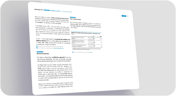 BASF Report 2021 Management’s Report – Our Management Systems 118 During our audits, we create a safety and environmental profile Costs and provisions that shows if we are properly addressing the existing hazard poten- tial. If this is not the case, we agree on measures and monitor their We continuously invest in reducing the impact of our actions on implementation, for example, with follow-up audits. the environment. We also establish appropriate provisions for envi- ronmental protection measures and the remediation of active and In the BASF Group in 2021, 143 environmental and safety audits former sites. were conducted at 71 sites (2020: 112 audits at 60 sites). The sites were audited based on their individual risk profile. Auditing of the sites acquired from Solvay could not start in late 2021 as planned Costs and provisions for environmental protection in the BASF Group due to the coronavirus pandemic. These audits will be performed Million € in 2022. 2021 2020 Operating costs for environmental 1,133 1,125 protection In 2021, 13 sites were audited on occupational medicine and health protection (2020: 1). Online audits were conducted for 10 Investments in new and improved environmental protection plants and 239 231 of these sites. These remote audits focused on documented facilitiesa processes and management systems. Provisions for environmental protection 926 693 measures and remediationb For more information on occupational health and safety, see page 119 onward ® a Investments comprise end-of-pipe measures as well as integrated environmental protection measures. For more information on Responsible Care , see basf.com/en/responsible-care b Values shown refer to December 31 of the respective year. For more information, see Notes 9 and 23 on pages 224 and 260 External certification We pursue a decentralized certification approach for our busi- ness units and subsidiaries. This takes into account local needs, internal and legal requirements, and our customers’ requirements. Our Responsible Care audit system complies with the ISO 19011 standard and is certified according to ISO 9001. Worldwide, 130 BASF production sites are certified in accordance with ISO 14001 and EMAS (Eco-Management and Audit Scheme) (2020: 128). In addition, 54 sites worldwide are certified in accordance with OHSAS 18001 or ISO 45001 (2020: 51). Several BASF sites also have an ISO 17020 accredited inspection body for user inspection or an ISO 17025 accredited analytical laboratory for environmental emissions analyses. Based on our customers’ requirements, quality management at our production sites is generally certified according to external interna- tional standards such as ISO 9001, GMP, FAMI QS or IATF 16949.