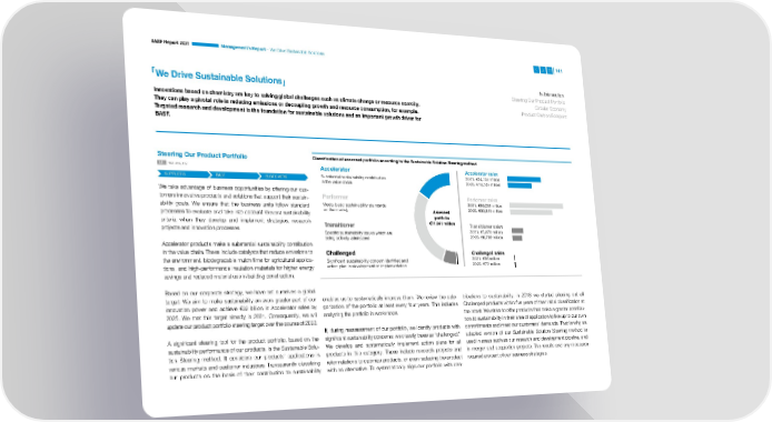 BASF Report 2021 Management’s Report – We Drive Sustainable Solutions 141 We Drive Sustainable Solutions In this section: Steering Our Product Portfolio Innovations based on chemistry are key to solving global challenges such as climate change or resource scarcity. Circular Economy They can play a pivotal role in reducing emissions or decoupling growth and resource consumption, for example. Product Carbon Footprint Targeted research and development is the foundation for sustainable solutions and an important growth driver for BASF. Steering Our Product Portfolio Classification of assessed portfolio according to the Sustainable Solution Steering method GRI 102, 416, 417 Accelerator Accelerator sales SUPPLIERS BASF CUSTOMERS Substantial sustainability contribution 2021: €24,103 million in the value chain 2020: €16,740 million We take advantage of business opportunities by offering our cus- tomers innovative products and solutions that support their sustain- Performer Performer sales ability goals. We ensure that the business units follow standard Meets basic sustainability standards 2021: €39,033 million processes to evaluate and take into account relevant sustainability on the market Assessed 2020: €30,519 million criteria when they develop and implement strategies, research portfolio Transitioner €71,041 million Transitioner sales projects and innovation processes. Specific sustainability issues which are 2021: €7,879 million being actively addressed 2020: €6,799 million Accelerator products make a substantial sustainability contribution in the value chain. These include catalysts that reduce emissions to Challenged Challenged sales the environment, biodegradable mulch films for agricultural applica- Significant sustainability concern identified and 2021: €26 million tions, and high-performance insulation materials for higher energy action plan in development or implementation 2020: €72 million savings and reduced material use in building construction. Based on our corporate strategy, we have set ourselves a global target: We aim to make sustainability an even greater part of our enables us to systematically improve them. We review the cate- tributions to sustainability, in 2018 we started phasing out all innovation power and achieve €22 billion in Accelerator sales by gorization of the portfolio at least every four years. This includes Challenged products within five years of their initial classification at 2025. We met this target already in 2021. Consequently, we will analyzing the portfolio in workshops. the latest. We strive to offer products that make a greater contribu- update our product portfolio steering target over the course of 2022. tion to sustainability in their area of application to live up to our own If, during reassessment of our portfolio, we identify products with commitments and meet our customers’ demands. That is why an A significant steering tool for the product portfolio, based on the significant sustainability concerns, we classify these as “ challenged.” adapted version of our Sustainable Solution Steering method is sustainability performance of our products, is the Sustainable Solu- We develop and systematically implement action plans for all used in areas such as our research and development pipeline, and tion Steering method. It considers our products’ applications in products in this category. These include research projects and in merger and acquisition projects. The results and any measures various markets and customer industries. Transparently classifying reformulations to optimize products, or even replacing the product required are part of our business strategies. our products on the basis of their contribution to sustainability with an alternative. To systematically align our portfolio with con-