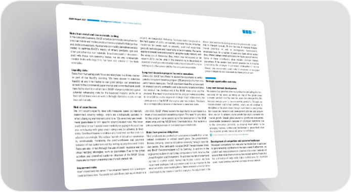 BASF Report 2021 Management’s Report – Opportunities and Risks 157 Risks from metal and raw materials trading projects are suspended. Following the impairments recognized in interest rates used in discounting pension obligations leads immedi- In the catalysts business, BASF employs commodity derivatives for the third quarter of 2020, we currently consider the risk of further ately to changes in equity. To limit the risks of changing financial precious metals and trades precious metals on behalf of third parties impairment for assets such as property, plant and equipment, market conditions as well as demographic developments, and on its own account. Appropriate commodity derivatives are also goodwill, technologies and trademarks to be immaterial. The same employees have, for a number of years now, been almost exclu- traded to optimize BASF’s supply of refinery products, gas and applies to investments accounted for using the equity method, with sively offered defined contribution plans for future years of service. other petrochemical raw materials. To address specific risks associ- the exception of Wintershall Dea, which was remeasured at fair Some of these contribution plans include minimum interest ated with these non-operating trades, we set and continuously value in 2019. As the value of the shareholding is dependent on guarantees. If the pension fund cannot generate this, it must be monitor limits with regard to the type and volume of the deals expected oil and gas price developments, impairments of the share- provided by the employer. A permanent continuation of the low concluded. holding and of the assets held by the company are possible. interest rate environment could make it necessary to recognize pension obligations and plan assets for these plans as well. Liquidity risks Long-term incentive program for senior executives Risks from fluctuating cash flows are recognized in a timely manner Since 2020, BASF has offered its leaders the opportunity to partici- as part of our liquidity planning. We have access to extensive pate in a long-term incentive program (LTI program) in the form or a Strategic opportunities and risks liquidity at any time thanks to our good ratings, our unrestricted performance share plan. The LTI plan incentivizes the achievement access to the commercial paper market and committed bank credit of strategic growth, profitability and sustainability targets and takes Long-term demand development lines. In the short to medium term, BASF is largely protected against into account the development of the BASF share price and the We assume that growth in chemical production (excluding pharma- potential refinancing risks by the balanced maturity profile of its dividend. The need for provisions for this program varies according ceuticals) will be about as strong as that of the global gross financial indebtedness as well as through diversification in various to assumptions on the degree of strategic target achievement, the domestic product over the next five years and stronger than the financial markets. development of the BASF share price and the dividend. This leads five-year average prior to the coronavirus pandemic. Through our to a corresponding increase or decrease in personnel costs. market-oriented and broad portfolio, which we will continue to Risk of asset losses strengthen in the years ahead through investments in new produc- We limit country-specific risks with measures based on internally Until 2020, BASF offered leaders the opportunity to participate in a tion capacities, research and development activities and acquisi- determined country ratings, which are continuously updated to share price-based compensation program. The need for provisions tions, we aim to achieve volume growth that slightly exceeds this reflect changing environment conditions. We selectively use invest- for this program varies according to the development of the BASF market growth. Should global economic growth see unexpected, ment guarantees to limit specific country-related risks. We lower share price and the MSCI World Chemicals Index; this leads to a considerable deceleration because of prolonged restrictions due credit risks for our financial investments by engaging in transactions corresponding increase or decrease in personnel costs. to the coronavirus pandemic, an ongoing weak period in the only with banks with good credit ratings and by adhering to fixed emerging markets, protectionist tendencies or geopolitical crises, limits. Creditworthiness is continuously monitored and the limits are Risks from pension obligations the expected growth rates could prove too ambitious. adjusted accordingly. We reduce the risk of default on receivables Most employees are granted company pension benefits from either For more information on the corporate strategy, see page 26 onward by continuously monitoring the creditworthiness and payment defined contribution or defined benefit plans. We predominantly behavior of our customers and by setting appropriate credit limits. finance company pension obligations externally through separate Development of competitive and customer landscape Risks are also limited through the use of credit insurance and indi- plan assets. This particularly includes BASF Pensionskasse VVaG We expect competitors from Asia and the Middle East in particular vidual hedging strategies, such as guarantees. Due to the global and BASF Pensionstreuhand e.V. in Germany, in addition to the to gain increasing significance in the years ahead. Furthermore, we activities and diversified customer structure of the BASF Group, large pension plans of our Group companies in North America, the predict that many producers in countries rich in raw materials will there are no major concentrations of credit default risk. United Kingdom and Switzerland. To address the risk of underfund- expand their value chains in consumer-oriented sectors. In addition, ing due to market-related fluctuations