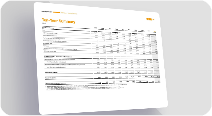 BASF Report 2021 Overviews – Ten-Year Summary 287 Ten-Year Summary Million € 2012a 2013b 2014 2015 2016 2017 2018 2019 2020 2021 Statement of income c d Sales 72,129 73,973 74,326 70,449 57,550 61,223 60,220 59,316 59,149 78,598 Income from operations (EBIT) 6,742 7,160 7,626 6,248 6,275 7,587c 5,974d 4,201 −191 7,677 Income before income taxes 5,977 6,600 7,203 5,548 5,395 6,882c 5,233d 3,302 −1.562 7,448 d Income after taxes from continuing operations – – – – – 5,592 4,116 2,546 −1.471 6,018 d Income after taxes from discontinued operations – – – – – 760 863 5,945 396 −36 Income after taxes 5,067 5,113 5,492 4,301 4,255 6,352 4,979 8,491 −1.075 5,982 Net income 4,819 4,792 5,155 3,987 4,056 6,078 4,707 8,421 −1.060 5,523 c d Income from operations before depreciation and amortization (EBITDA) 10,009 10,432 11,043 10,649 10,526 10,765 8,970 8,185 6,494 11,355 EBIT before special items 6,647 7,077 7,357 6,739 6,309 7,645c 6,281d 4,643 3,560 7,768 Capital expenditures, depreciation and amortization Additions to property, plant and equipment and intangible assets 5,263 7,726 7,285 6,013 7,258 4,364 10,735 4,097 4,869 4,881 of which property, plant and equipment 4,084 6,428 6,369 5,742 4,377 4,028 5,040 3,842 4,075 4,410 d Depreciation and amortization of property, plant and equipment and intangible assets 3,267 3,272 3,417 4,401 4,251 4,202 3,750 4,146 6,685 3,678 of which property, plant and equipment 2,594 2,631 2,770 3,600 3,691 3,586 3,155d 3,408 5,189 3,064 Employees at year-end 110,782 112,206 113,292 112,435 113,830 115,490 122,404 117,628 110,302 111,047 Personnel expenses 8,963 9,285 9,224 9,982 10,165 10,610 10,659 10,924 10,576 11,097 c 1,994d 2,158 2,086 2,216 Research and development expenses 1,732 1,849 1,884 1,953 1,863 1,843 a We have applied International Reporting Standards IFRS 10 and 11 as well as International Accounting Standard 19 (revised) since January 1, 2013. Figures for 2012 have been restated; no restatement was made for 2011 and earlier. b Figures for 2013 have been adjusted to reflect the dissolution of the natural gas trading business disposal group. c Figures for 2017 were restated with the presentation of the oil and gas activities as discontinued operations. For more information, see Note 1.4 to the Consolidated Financial Statements from page 203 onward d Figures for 2018 were restated with the presentation of the construction chemicals activities as discontinued operations. For more information, see Note 1.4 to the Consolidated Financial Statements from page 203 onward