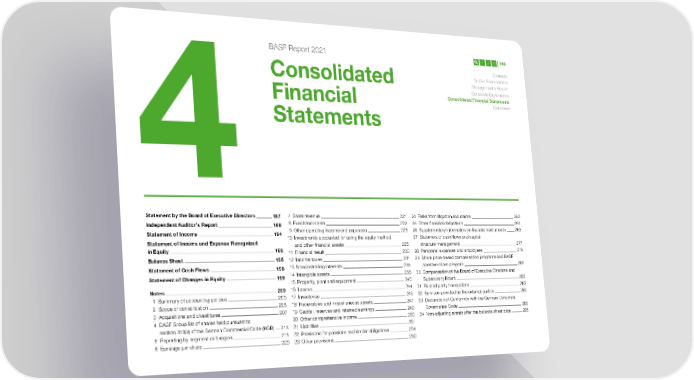 BASF Report 2021 186 Contents Consoli dated To Our Shareholders Management’s Report Corporate Governance Consolidated Financial Statements Financial Overviews 4Statements Statement by the Board of Executive Directors 187 7 Sales revenue 221 24 Risks from litigation and claims 262 Independent Auditor’s Report 188 8 Functional costs 222 25 Other financial obligations 263 Statement of Income 194 9 Other operating income and expenses 223 26 Supplementary information on financial instruments 263 10 Investments accounted for using the equity method 27 Statement of cash flows and capital Statement of Income and Expense Recognized and other financial assets 225 structure management 277 in Equity 195 11 Financial result 230 28 Personnel expenses and employees 279 Balance Sheet 196 12 Income taxes 231 29 Share price-based compensation programs and BASF Statement of Cash Flows 198 13 Noncontrolling interests 235 incentive share program 280 Statement of Changes in Equity 199 14 Intangible assets 236 30 Compensation of the Board of Executive Directors and 15 Property, plant and equipment 240 Supervisory Board 283 Notes 200 16 Leases 244 31 Related party transactions 283 1 Summary of accounting policies 200 17 Inventories 246 32 Services provided by the external auditor 285 2 Scope of consolidation 205 18 Receivables and miscellaneous assets 247 33 Declaration of Conformity with the German Corporate 3 Acquisitions and divestitures 207 19 Capital, reserves and retained earnings 249 Governance Code 285 4 BASF Group list of shares held pursuant to 20 Other comprehensive income 250 34 Non-adjusting events after the balance sheet date 285 section 313(2) of the German Commercial Code (HGB) 213 21 Liabilities 251 5 Reporting by segment and region 213 22 Provisions for pensions and similar obligations 254 6 Earnings per share 220 23 Other provisions 260