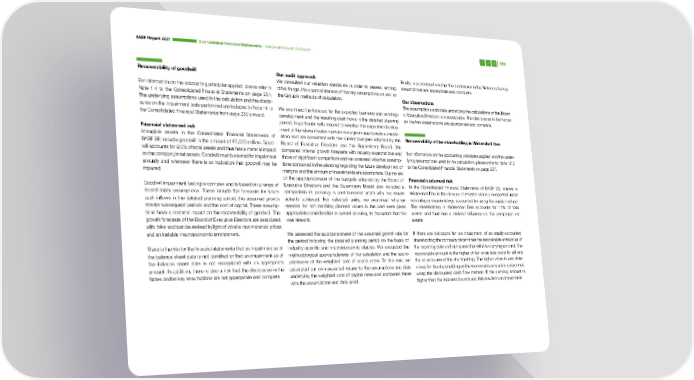 BASF Report 2021 Consoli dated Financial Statements – Independent Auditor’s Report 189 Recoverability of goodwill Our audit approach Finally, we assessed whether the disclosures in the Notes on the key We consulted our valuation specialists in order to assess, among assumptions are appropriate and complete. For information on the accounting principles applied, please refer to other things, the appropriateness of the key assumptions as well as Note 1.4 to the Consolidated Financial Statements on page 204. the Group’s methods of calculation. Our observations The underlying assumptions used in the calculation and the disclo- The assumptions and data underlying the calculations of the Board sures on the impairment tests performed are included in Note 14 to We examined the forecast for the expected business and earnings of Executive Directors are acceptable. The disclosures in the Notes the Consolidated Financial Statements from page 236 onward. development and the resulting cash flows in the detailed planning on the key assumptions are appropriate and complete. period, in particular with respect to whether the expected develop- Financial statement risk ment of the relevant sales markets were given appropriate consider- Intangible assets in the Consolidated Financial Statements of ation and are consistent with the current budgets adopted by the Recoverability of the shareholding in Wintershall Dea BASF SE include goodwill in the amount of €7,520 million. Good- Board of Executive Directors and the Supervisory Board. We will accounts for 8.6% of total assets and thus has a material impact compared internal growth forecasts with industry expectations and For information on the accounting principles applied and the under- on the company’s net assets. Goodwill must be tested for impairment those of significant competitors and we assessed whether assump- lying assumptions used in the calculation, please refer to Note 10.2 annually and whenever there is an indication that goodwill may be tions contained in the planning regarding the future development of to the Consolidated Financial Statements on page 227. impaired. margins and the amount of investments are appropriate. Our review of the appropriateness of the budgets adopted by the Board of Financial statement risk Goodwill impairment testing is complex and is based on a range of Execu tive Directors and the Supervisory Board also included a In the Consolidated Financial Statements of BASF SE, shares in discretionary assumptions. These include the forecasts for future comparison of planning in past business years with the results Wintershall Dea in the amount of €9,583 million are reported under cash inflows in the detailed planning period, the assumed growth actually achieved. For selected units, we examined whether non-integral shareholdings accounted for using the equity method. rate for subsequent periods and the cost of capital. These assump- reasons for not reaching planned values in the past were given The shareholding in Wintershall Dea accounts for 11% of total tions have a material impact on the recoverability of goodwill. The appropriate consideration in current planning, to the extent that this assets and thus has a material influence on the company’s net growth forecasts of the Board of Executive Directors are associated was relevant. assets. with risks and can be revised in light of volatile raw materials prices e are indicators for an impairment of an equity-accounted and an instable macroeconomic environment. We assessed the appropriateness of the assumed growth rate for If ther the period following the detailed planning period on the basis of shareholding the company determines the recoverable amount as of There is the risk for the financial statements that an impairment as of industry-specific and macroeconomic studies. We evaluated the the reporting date and compares this with the carrying amount. The the balance sheet date is not identified or that an impairment as of methodological appropriateness of the calculation and the appro- recoverable amount is the higher of fair value less costs to sell and the balance sheet date is not recognized with an appropriate priateness of the weighted cost of capital rates. To this end, we the value in use of the shareholding. The higher value in use deter- amount. In addition, there is also a risk that the disclosures in the calculated our own expected values for the assumptions and data mined for the shareholding as the recoverable amount is determined Notes on the key assumptions are not appropriate and complete. underlying the weighted cost of capital rates and compared these using the discounted cash flow method. If the carrying amount is with the assumptions and data used. higher than the recoverable amount, this results in an impairment.
