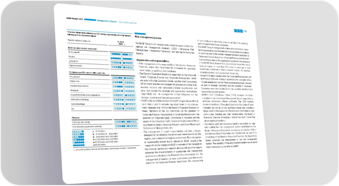 BASF Report 2021 Management’s Report – Opportunities and Risks 152 Potential short-term effects on EBIT of key opportunity and risk factors Risk management process of commodity price risks takes place in the Global Procurement a subsequent to measures taken unit or in authorized Group companies. Possible variations related to: Outlook The BASF Group’s risk management process is based on the inter- – The BASF Group’s management is informed of short-term opera- – 2022 + national risk management standard, COSO II Enterprise Risk tional opportunities and risks that fall within an observation period Business environment and sector Management – Integrated Framework, and has the following key of up to one year in the monthly management report produced by features: Corporate Finance. In addition, Corporate Finance provides infor- Market growth mation twice a year on the aggregated opportunity/risk exposure Margins Organization and responsibilities of the BASF Group. Furthermore, any arising individual risks which Competition – Risk management is the responsibility of the Board of Executive have an impact of more than €10 million on earnings or risks Regulation/policy Directors, which also determines the processes for approving qualitatively evaluated to have a material impact, for example, investments, acquisitions and divestitures. reputational risks, must be reported immediately. Company-specific opportunities and risks – The Board of Executive Directors is supported by the Corporate – As part of strategy development, the Corporate Development unit Procurement Center. Corporate Finance and Corporate Development, which additionally conducts strategic opportunity/risk analyses with a are units within the Corporate Center, and the Chief Compliance 10-year assessment period. These analyses are annually reviewed Supply chain Officer coordinate the risk management process at a Group level, as part of strategic controlling and are adapted if necessary. Investments/production examine financial and sustainability-related opportunities and Scenarios were also developed to map possible developments Personnel risks, and provide the structure and appropriate methodology. beyond the ten-year horizon. Opportunity and risk management is thus integrated into the – BASF’s Chief Compliance Officer (CCO) manages the imple- Acquisitions/divestitures/cooperations strategy, planning and budgeting processes. mentation of our Compliance Management System, supported by Information technology – BASF’s risk committee reviews the BASF Group’s risk portfolio at additional compliance officers worldwide. The CCO regularly Compliance/legal least twice a year to evaluate any adjustments to risk-manage- reports to the Board of Executive Directors on the status of imple- Tax ment measures and informs the Board of Executive Directors of mentation as well as on any significant results and provides a these. Members of the risk committee are the president of status report to the Supervisory Board’s Audit Committee at least Corporate Finance, the president of Corporate Development, the once a year, including any major developments. The Board of Financial president of Corporate Legal, Compliance & Insurance and the Executive Directors immediately informs the Audit Committee Exchange rate volatility heads of the Corporate Audit, Corporate Environmental Protec- about significant incidents. Other financial opportunities and risks tion, Health & Safety, Corporate Treasury, and Group Reporting & – The internal audit unit (Corporate Audit) is responsible for regu- Performance Management units. larly auditing the risk management system established by the €100 million – The management of specific opportunities and risks is largely Board of Executive Directors in accordance with section 91(2) of €100 million €500 million €500 million €1,000 million delegated to the divisions, the service and research units and the the German Stock Corporation Act. Furthermore, as part of its €1,000 million €1,500 million regions, and is steered at a regional or local level. This also applies monitoring of the Board of Executive Directors, the Supervisory €1,500 million €2,000 million to sustainability-related topics relevant to BASF including the Board considers the effectiveness of the risk management €2,000 million impact of climate change on BASF. A network of risk managers in system. The suitability of the early detection system we set up for a Using a 95% confidence interval per risk factor based on planned values; summation is not permissible the divisions, service and research units as well as in the regions risks is evaluated by our external auditor. advances the implementation of appropriate risk management practices in daily operations. Financial risks are an exception. The management of liquidity, currency and interest rate risks is con- ducted in the Corporate Finance department. The management