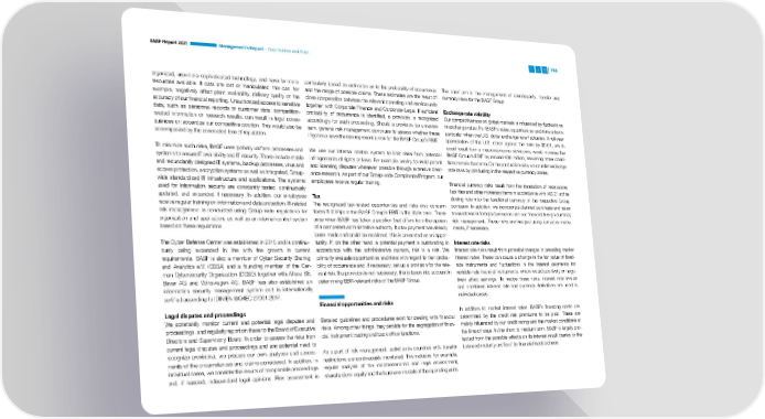 BASF Report 2021 Management’s Report – Opportunities and Risks 156 organized, use more sophisticated technology, and have far more particularly based on estimates as to the probability of occurrence The chief aim is the management of counterparty, transfer and resources available. If data are lost or manipulated, this can, for and the range of possible claims. These estimates are the result of currency risks for the BASF Group. example, negatively affect plant availability, delivery quality or the close cooperation between the relevant operating and service units accuracy of our financial reporting. Unauthorized access to sensitive together with Corporate Finance and Corporate Legal. If sufficient Exchange rate volatility data, such as personnel records or customer data, competition- probability of occurrence is identified, a provision is recognized Our competitiveness on global markets is influenced by fluctuations related information or research results, can result in legal conse- accordingly for each proceeding. Should a provision be unneces- in exchange rates. For BASF’s sales, opportunities and risks arise in quences or jeopardize our competitive position. This would also be sary, general risk management continues to assess whether these particular when the U.S. dollar exchange rate fluctuates. A full-year accompanied by the associated loss of reputation. litigations nevertheless represent a risk for the BASF Group’s EBIT. appreciation of the U.S. dollar against the euro by $0.01, which could result from a macroeconomic slowdown, would increase the To minimize such risks, BASF uses globally uniform processes and We use our internal control system to limit risks from potential BASF Group’s EBIT by around €30 million, assuming other condi- systems to ensure IT availability and IT security. These include stable infringements of rights or laws. For example, we try to avoid patent exchange tions remain the same. On the production side, we counter and redundantly designed IT systems, backup processes, virus and and licensing disputes whenever possible through extensive clear- rate risks by producing in the respective currency zones. access protection, encryption systems as well as integrated, Group- ance research. As part of our Group-wide Compliance Program, our wide standardized IT infrastructure and applications. The systems employees receive regular training. Financial currency risks result from the translation of receivables, used for information security are constantly tested, continuously liabilities and other monetary items in accordance with IAS 21 at the updated, and expanded if necessary. In addition, our employees Tax closing rate into the functional currency of the respective Group receive regular training on information and data protection. IT-related The recognized tax-related opportunities and risks only concern company. In addition, we incorporate planned purchase and sales risk management is conducted using Group-wide regulations for taxes that impact the BASF Group’s EBIT in the short term. These transactions in foreign currencies into our financial foreign currency organization and application, as well as an internal control system arise when BASF has taken a position that differs from the opinion risk management. These risks are hedged using derivative instru- based on these regulations. of a competent administrative authority. If a tax payment has already ments, if necessary. been made and could be reclaimed, this is presented as an oppor- The Cyber Defense Center was established in 2015 and is continu- tunity. If, on the other hand, a potential payment is outstanding in Interest rate risks ously being expanded in line with the growth in current accordance with the administrative opinion, this is a risk. We Interest rate risks result from potential changes in prevailing market requirements. BASF is also a member of Cyber Security Sharing primarily evaluate opportunities and risks with regard to their proba- interest rates. These can cause a change in the fair value of fixed- and Analytics e.V. (CSSA) and a founding member of the Ger- bility of occurrence and, if necessary, set up a provision for the rele- rate instruments and fluctuations in the interest payments for man Cybersecurity Organization (DCSO) together with Allianz SE, vant risk. If a provision is not necessary, this is taken into account in variable- rate financial instruments, which would positively or nega- Bayer AG and Volkswagen AG. BASF has also established an determining EBIT-relevant risks of the BASF Group. tively affect earnings. To hedge these risks, interest rate swaps information security management system and is internationally and combined interest rate and currency derivatives are used in certified according to IDIN EN ISO/IEC 27001:2017. individual cases. Financial opportunities and risks Legal disputes and proceedings In addition to market interest rates, BASF’s financing costs are We constantly monitor current and potential legal disputes and Detailed guidelines and procedures exist for dealing with financial determined by the credit risk premiums to be paid. These are proceedings, and regularly report on these to the Board of Executive risks. Among other things, they provide for the segregation of finan- mainly influenced by our credit rating and the market conditions at Directors and Supervisory Board. In order to assess the risks from cial instrument trading and back office functions. the time of issue. In the short to medium term, BASF is largely pro- current legal disputes and proceedings and any potential need to tected from the possible effects on its interest result thanks to the recognize provisions, we prepare our own analyses and assess- As a part of risk management, activities in countries with transfer balanced maturity profile of its financial indebtedness. ments of the circumstances and claims considered. In addition, in restrictions are continuously monito