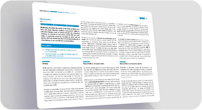 BASF Report 2021 Management’s Report – Biodiversity 138 Biodiversity land-use change, climate change, invasive species, overexploitation own initiatives, such as our rambutan program. This was launched GRI 102, 103, 304 and pollution. Our analysis showed that our impacts along the value in 2014 in close collaboration with partners in Vietnam to source SUPPLIERS BASF CUSTOMERS chain mainly relate to the drivers of climate change, land-use change botanical ingredients for cosmetic products from certified organic and pollution. We counteract the climate change driver of bio- rambutan gardens. In cooperation with local farmers and NGOs, Biodiversity describes the variety of life forms on Earth. Low diversity loss – and in this way, help to preserve biodiversity – with BASF’s program promotes the preservation of biodiverse habitats, flora and fauna diversity weakens ecosystems’ ability to our climate protection measures, which play an integral role in all our as well as good agricultural practices, gender equity and fair working withstand changes such as climate change. As a chemical impact areas (see page 126). conditions. company, we depend on ecosystem services like the avail- ability of renewable resources and high air, water and soil We use various methods to measure our sustainability perfor- Our position on forest protection sets out our commitment to quality, while also influencing them. Protecting biodiversity is mance that implicitly and explicitly consider relevant risks and preserving biodiversity in areas of High Conservation Value such as a key element of our commitment to sustainability. opportunities for biodiversity. These include the Eco-Efficiency High Carbon Stock forest areas and peatlands in the procurement ®, Sustainable Solution Steering, Value to Analysis, SEEbalance of renewable raw materials. BASF participated in the “Forests” Society, AgBalance® and the corresponding biodiversity calculator. assessment conducted by the international organization CDP for At a glance Under Value to Society, we assess land use along value chains, the second time in 2021 and achieved a score of A–, again giving it ▪ Strategic alignment of our biodiversity measures based on among other things. Newly developed assessment methods help us Leadership status. CPD is a nonprofit organization that evaluates impact assessments to understand further influences on biodiversity. On the basis of this companies’ management of the environmental risks and opportuni- ▪ Commitment to preserving biodiversity along the entire value understanding, we seek dialog with partners and enter into strategic ties relating to forests, among other things. The assessment is chain with strategic partnerships partnerships, through which we drive forward measures to protect conducted based on detailed insights into the palm value chain and biodiversity around the world. activities that impact ecosystems and natural habitats. Strategy Responsibility to our supply chains Responsibility to our sites and production BASF sees the United Nations’ Convention on Biological Diversity Some of the business activities of our raw material suppliers involve Preservation of biodiversity is taken into consideration in the and the Sustainable Development Goals (SDGs) – including Life land uses that can influence biodiversity (biodiversity loss driver: manage ment of our sites. We operate our facilities in a responsible below water (SDG 14) and Life on land (SDG 15) – as important land-use change). We have laid down our expectations of our sup- manner and minimize negative effects on the environment (bio- orientation and reference frameworks. Our measures help to pre- pliers with regard to environmental, labor and social standards in the diversity loss driver: pollution) by keeping air, water and soil emissions serve biodiversity and meet our responsibility to maintaining the supply chain in the Supplier Code of Conduct (see page 109). as low as possible and reducing and avoiding waste (see page 133 wellbeing of the environment and society. Our corporate sustain- for more information). ability goals on climate protection, product portfolio, circular eco- BASF procures a variety of renewable raw materials. In the procure- nomy, water management and responsible procurement also help ment of palm and palm kernel oil in particular, there is an elevated Our site management measures consider our impact on the bio- to protect biodiversity. risk that forest areas are cleared to create farmland. To improve diversity loss driver of land-use change. For example, given the sustainability in procurement, we established the BASF Palm Com- rele vance of conservation areas to preserving diversity, we check We align our biodiversity measures with the impact of our business mitment in 2011, which was updated in 2015 and is implemented how close our production sites are to internationally recognized activities along the value chain. Our focus here is on three impact with our Palm Sourcing Policy. Third-party certification with stan- conservation areas. In 2021, we included this indicator in our areas: supply chains, sites and production, and product impact. We dards such as the Roundtable on Sustainable Palm Oil (RSPO) environmental database. This allows us to raise awareness of bio- analyzed these in an internal workshop according to the five drivers standard enables us to take biodiversity criteria into account when diversity at local level and draw attention to potential impacts of our of biodiversity loss as defined by the Intergovernmental Science- purchasing raw materials (see page 113). We are also committed to sites on these areas. Four percent of our production sites are Policy Platform on Biodiversity and Ecosystem Services. These are the environmental sustainability of other supply chains through our adjacent to a Ramsar site and 1% are adjacent to a category I, II or