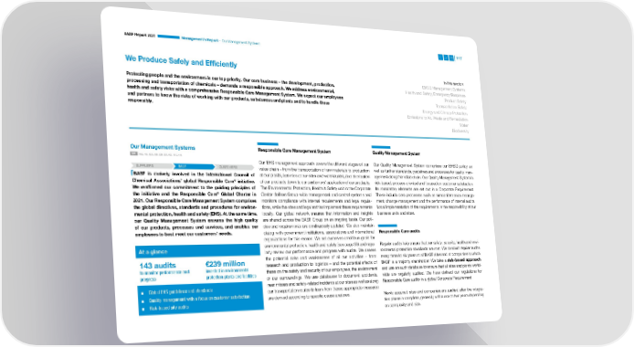 BASF Report 2021 Management’s Report – Our Management Systems 117 We Produce Safely and Efficiently In this section: Protecting people and the environment is our top priority. Our core business – the development, production, EHSQ Management Systems processing and transportation of chemicals – demands a responsible approach. We address environmental, Health and Safety, Emergency Response health and safety risks with a comprehensive Responsible Care Management System. We expect our employees Product Safety and partners to know the risks of working with our products, substances and plants and to handle these Transportation Safety responsibly. Energy and Climate Protection Emissions to Air, Waste and Remediation Water Biodiversity Our Management Systems Responsible Care Management System Quality Management System GRI 102, 103, 303, 305, 306, 307, 403, 410, 418 Our EHS management approach covers the different stages of our Our Quality Management System comprises our EHSQ policy as SUPPLIERS BASF CUSTOMERS value chain – from the transportation of raw materials to production well as further standards, guidelines and processes for quality man- BASF is actively involved in the International Council of at our plants, activities at our sites and warehouses, and distribution age ment along the value chain. Our Quality Management System is ® Chemical Associations’ global Responsible Care initiative. of our products down to our customers’ application of our products. risk-based, process-oriented and focused on customer satisfaction. We reaffirmed our commitment to the guiding principles of The Environmental Protection, Health & Safety unit in the Corporate Its mandatory elements are set out in a Corporate Requirement. ® Global Charter in the initiative and the Responsible Care Center defines Group-wide management and control systems and These include core processes such as nonconformance manage- 2021. Our Responsible Care Management System comprises monitors compliance with internal requirements and legal regula- ment, change management and the performance of internal audits. the global directives, standards and procedures for environ- tions, while the sites and legal entities implement these requirements Local implementation of the requirements is the responsibility of our mental protection, health and safety (EHS). At the same time, locally. Our global network ensures that information and insights business units and sites. our Quality Management System ensures the high quality are shared across the BASF Group on an ongoing basis. Our poli- of our products, processes and services, and enables our cies and requirements are continuously updated. We also maintain employees to best meet our customers’ needs. dialog with government institutions, associations and international Responsible Care audits organizations for this reason. We set ourselves ambitious goals for At a glance environmental protection, health and safety (see page 36) and regu- Regular audits help ensure that our safety, security, health and envi- larly review our performance and progress with audits. We assess ronmental protection standards are met. We conduct regular audits 143 audits €239 million the potential risks and weaknesses of all our activities – from every three to six years at all BASF sites and at companies in which to monitor performance and invested in environmental research and production to logistics – and the potential effects of BASF is a majority shareholder. We take a risk-based approach progress protection plants and facilities these on the safety and security of our employees, the environment and use an audit database to ensure that all sites and plants world- or our surroundings. We use databases to document accidents, wide are regularly audited. We have defined our regulations for ▪ Global EHS guidelines and standards near misses and safety-related incidents at our sites as well as along Responsible Care audits in a global Corporate Requirement. ▪ Quality management with a focus on customer satisfaction our transportation routes to learn from these; appropriate measures are derived according to specific cause analyses. Newly acquired sites and companies are audited after the integra- ▪ Risk-based site audits tion phase is complete, generally within one to two years depending on complexity and size.