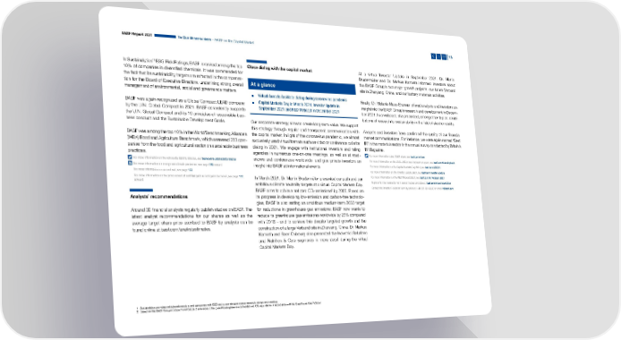 BASF Report 2021 To Our Shareholders – BASF on the Capital Market 15 1 In Sustainalytics’ ESG Risk Ratings, BASF is ranked among the top Close dialog with the capital market At a virtual Investor Update in September 2021, Dr. Martin 10% of companies in diversified chemicals. It was commended for Brudermüller and Dr. Markus Kamieth informed investors about the fact that its sustainability targets are reflected in the compensa- the BASF Group’s two major growth projects: our future Verbund tion for the Board of Executive Directors, underlining strong overall At a glance site in Zhanjiang, China, and our battery materials activities. management of environmental, social and governance matters. ▪ Virtual formats facilitate dialog during coronavirus pandemic Finally, Dr. Melanie Maas-Brunner offered analysts and investors an BASF was again recognized as a Global Compact LEAD company ▪ Capital Markets Day in March 2021, Investor Update in insight into the BASF Group’s research and development in Decem- by the U.N. Global Compact in 2021. BASF consistently supports September 2021 and R&D Webcast in December 2021 ber 2021. In a webcast, she presented, among other topics, contri- the U.N. Global Compact and its 10 principles of responsible busi- butions of research to sustainability in the field of electromobility. ness conduct and the Sustainable Development Goals. Our corporate strategy aims to create long-term value. We support this strategy through regular and transparent communication with Analysts and investors have confirmed the quality of our financial BASF was among the top 10% in the World Benchmarking Alliance’s the capital market. In light of the coronavirus pandemic, we almost market communications. For instance, we were again named “Best (WBA) Food and Agriculture Benchmark, which assessed 350 com- exclusively used virtual formats such as video or conference calls for IR” in the materials sector in the annual survey conducted by Britain’s panies from the food and agricultural sector on sustainable business dialog in 2021. We engage with institutional investors and rating IR Magazine. practices. agencies in numerous one-on-one meetings, as well as at road- For more information about BASF stock, see basf.com/share For more information on the key sustainability indexes, see basf.com/sustainabilityindexes shows and conferences worldwide, and give private investors an For more information on the 2022–2023 share buyback program, see basf.com/sharebuyback For more information on energy and climate protection, see page 126 onward insight into BASF at informational events. For more information on the Capital Markets Day 2021, see basf.com/CMD21 For more information on air and soil, see page 133 For more information on the Investor Update 2021, see basf.com/investor-update For more information on the procurement of certified palm oil and palm kernel oil, see page 112 In March 2021, Dr. Martin Brudermüller presented our path and our For more information on the R&D Webcast 2021, see basf.com/rd-webcast-2021 onward ambitious climate neutrality targets at a virtual Capital Markets Day. Register for the newsletter with current topics and dates at basf.com/share/newsletter BASF aims to achieve net zero CO emissions2 by 2050. Based on Contact the Investor Relations team by phone at +49 621 60-48230 or email [email protected] 2 Analysts’ recommendations its progress in developing low-emission and carbon-free technolo- gies, BASF is also setting an ambitious medium-term 2030 target Around 30 financial analysts regularly publish studies on BASF. The for reductions in greenhouse gas emissions: BASF now wants to latest analyst recommendations for our shares as well as the reduce its greenhouse gas emissions worldwide by 25% compared average target share price ascribed to BASF by analysts can be with 2018 – and to achieve this despite targeted growth and the found online at basf.com/analystestimates. construction of a large Verbund site in Zhanjiang, China. Dr. Markus Kamieth and Saori Dubourg also presented the Industrial Solutions and Nutrition & Care segments in more detail during the virtual Capital Markets Day. 1 Sustainalytics provides institutional investors and companies with ESG and corporate governance research, ratings and analytics. 2 Based on the BASF Group’s Scope 1 and Scope 2 emissions; other greenhouse gases are converted into CO equivalents in accordance with the Greenhouse Gas Protocol 2