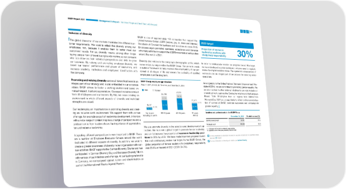 BASF Report 2021 Management’s Report – We Value People and Treat Them with Respect 99 Inclusion of diversity BASF is one of approximately 150 companies that support the 2030 target United Nations Global LGBTI (lesbian, gay, bi, trans and intersex) The global character of our markets translates into different cus- Standards of Conduct for business and has done so since 2018. Proportion of women in tomer requirements. We want to reflect this diversity among our Employees again promoted openness, acceptance and tolerance leadership positions with employees, too, because it enables them to better meet our with many activities to support the LGBTI movement at various sites disciplinary responsibility 30% customers’ needs. For us, diversity means, among other things, around the world in 2021. having people from different backgrounds working at our company who can draw on their individual perspectives and skills to grow Diversity also relates to the company’s demographic profile, which In order to continuously monitor our progress toward this target, our business. By valuing and promoting employee diversity, we varies widely by region within the BASF Group. Our aim is to create we have developed a global dashboard, which is used to regularly boost our teams’ performance and power of innovation, and a suitable framework to help maintain the employability of our per- review the implementation status. The systematic advancement of increase creativity, motivation and employees’ identification with sonnel at all stages of life and ensure the availability of qualified women is also an integral part of our process for selecting senior the company. employees over the long term. executives. Promoting and valuing diversity across all hierarchical levels is an BASF Group employee age structure As a signatory to the United Nations’ Women’s Empowerment Prin- integral part of our strategy and is also embedded in our corporate (Total: 111,047, of which 26.1% women, as of December 31, 2021) ciples (WEPs), we are committed to promoting gender equality. We values. BASF strives to foster a working environment based on Men Women are also involved in other external initiatives to promote inclusion of mutual respect, trust and appreciation. We expect inclusive conduct 42,531 diversity at work, such as the Chefsache initiative and the European from all employees and our leaders. By this, we mean creating an 38,798 Round Table. Employees from all regions took International 26.4% environment in which different aspects of diversity and individual 30.3% Women’s Day 2021 as an opportunity to reflect on the current situa- 21,511 strengths are valued. 18.0% tion of women at BASF, celebrate successes and campaign for 8,207 69.7% 73.6% 25.9% 82.0% greater equality. Our leaders play an important role in promoting diversity and creat- 74.1% ing an inclusive work environment. We support them with various Up to and 26–39 years 40–54 years 55 years Leaders and professionals in the BASF Group offerings, for example as part of leadership development. A toolbox including 25 years and up December 31, 2021 Of which women (%) with a wide range of content inspires a change of perspective and a (Senior) executivesa 9,006 25.6 podcast series from leaders shows the importance of appreciative, Professionalsb 40,030 32.5 fair and inclusive leadership. We also promote diversity in the selection and development of our leaders. We have set a global target to promote female leadership a Employees with disciplinary leadership responsibilities b Specialists without disciplinary leadership responsibilities Integrating different perspectives is very important to BASF. There and aim to increase the proportion of women in leadership posi- are a number of Employee Resource Groups around the world tions to 30% by 2030. We have made important progress toward For more information on diversity in the Board of Executive Directors and the Supervisory Board, dedicated to different aspects of diversity. In addition, we want to this and continuously review our target. In the BASF Group, the see page 167 onward create a greater awareness of diversity in our organization with vari- global proportion of female leaders with disciplinary responsibility For more information on diversity and inclusion, see basf.com/diversity ous activities. BASF supports the German Diversity Charter and has was 25.6% at the end of 2021 (2020: 24.3%). participated in German Diversity Day and European Diversity Month with various virtual initiatives and offerings. At our Ludwigshafen site in Germany, we campaigned against racism and discrimination as part of the International Weeks Against Racism.