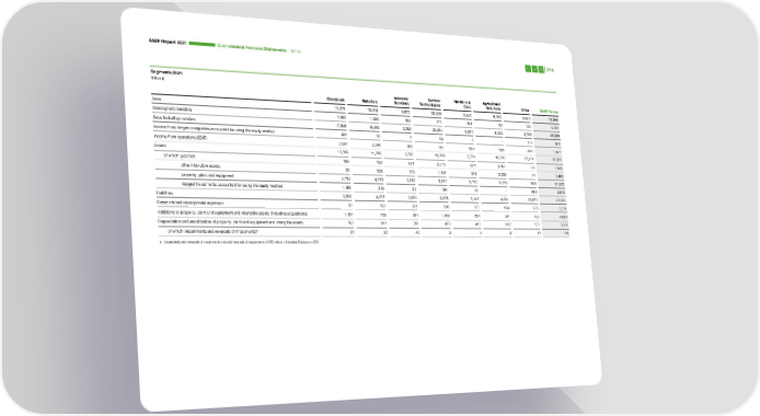 BASF Report 2021 Consoli dated Financial Statements – Notes 216 Segments 2021 Million € Industrial Surface Nutrition & Agricultural Chemicals Materials Solutions Technologies Care Solutions Other BASF Group Sales 13,579 15,214 8,876 22,659 6,442 8,162 3,666 78,598 Intersegment transfers 4,269 1,250 420 171 491 40 120 6,761 Sales including transfers 17,848 16,464 9,296 22,831 6,933 8,202 3,786 85,358 Income from integral companies accounted for using the equity method 409 20 9 94 6 − 136 675 Income from operations (EBIT) 2,997 2,345 965 761 554 696 −641 7,677 Assets 10,369 11,286 6,302 13,769 7,231 15,305 23,121 87,383 of which goodwill 199 189 631 2,373 874 3,187 66 7,520 other intangible assets 55 632 172 1,104 379 3,596 41 5,980 property, plant and equipment 4,734 4,732 2,025 3,817 2,716 2,570 959 21,553 integral investments accounted for using the equity method 1,199 212 21 484 42 − 582 2,540 Liabilities 3,820 4,372 2,621 3,678 3,146 4,091 23,573 45,301 Research and development expenses 97 193 175 296 172 904 378 2,216 Additions to property, plant and equipment and intangible assets (including acquisitions) 1,157 709 361 1,469 654 347 183 4,881 Depreciation and amortization of property, plant and equipment and intangible assets 767 817 380 483 413 662 157 3,678 of which impairments and reversals of impairmentsa 31 33 43 9 6 8 14 144 a Impairments and reversals of impairments included reversals of impairments of €12 million in Industrial Solutions in 2021.