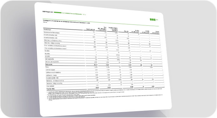 BASF Report 2021 Consoli dated Financial Statements – Notes 271 Carrying amounts and fair values of financial instruments as of December 31, 2020 Million € Total Valuation category within application in accordance Of which Of which Of which b c d e Carrying amount scope of IFRS 7 with IFRS 9 Fair value fair value level 1 fair value level 2 fair value level 3 a Shareholdings 533 533 FVTPL 94 93 1 – Receivables from finance leases 44 44 n/a 44 – – – Accounts receivable, trade 9,422 9,422 AC 9,422 – – – Accounts receivable, trade 44 44 FVTPL 44 – 44 – Derivatives – no hedge accounting 387 387 FVTPL 387 1 386 – Derivatives – hedge accounting 132 132 n/a 132 0 132 – f Other receivables and miscellaneous assets 4,889 1,075 AC 1,075 – – – f Other receivables and miscellaneous assets 133 133 FVTPL 133 – 133 – Securities 8 8 AC 8 – – – Securities 0 0 FVTOCI 0 – 0 – Securities 249 249 FVTPL 249 207 42 – Cash equivalents 145 145 FVTPL 145 145 – – Cash and cash equivalents 4,185 4,185 AC 4,185 – – – Total assets 20,171 16,357 15,918 446 738 − Bonds 14,189 14,189 AC 15,500 – 15,500 – Commercial paper 1,290 1,290 AC 1,290 – – – Liabilities to credit institutions 3,735 3,735 AC 3,735 – – – Liabilities from leases 1,360 1,360 n/a 1,360 – – – Accounts payable, trade 5,291 5,291 AC 5,291 – – – Derivatives – no hedge accounting 957 957 FVTPL 957 25 932 – Derivatives – hedge accounting 1 1 n/a 1 – 1 – f Other liabilities 2,833 1,804 AC 1,804 – – – Total liabilities 29,656 28,627 29,938 25 16,433 − a In general, only significant shareholdings are measured at fair value. All insignificant shareholdings are measured at cost (carrying amount: €439 million). Fair value level 1 is applied to publicly listed shareholdings. Level 2 is applied to shar eholdings for which valuation is based on parameters observable in the market to the greatest extent possible. These may be adjusted to reflect valuation-relevant characteristics of the respective shareholding in the fair value. b AC: amortized cost; FVTOCI: fair value through other comprehensive income; FVTPL: fair value through profit or loss; a more detailed description of the categories can be found in Note 26.1 from page 263 onward. c Fair value was determined based on quoted, unadjusted prices on active markets. d Fair value was determined based on parameters for which directly or indirectly quoted prices on active markets were available. e Fair value was determined based on parameters for which there was no observable market data. f Does not include separately shown derivatives or receivables and liabilities from finance leases. If miscellaneous receivables are valued at fair value through profit or loss, their valuation is generally based on parameters observable on the market. These are adjusted to reflect valuation-relevant characteristics of the respective assets in the fair value.