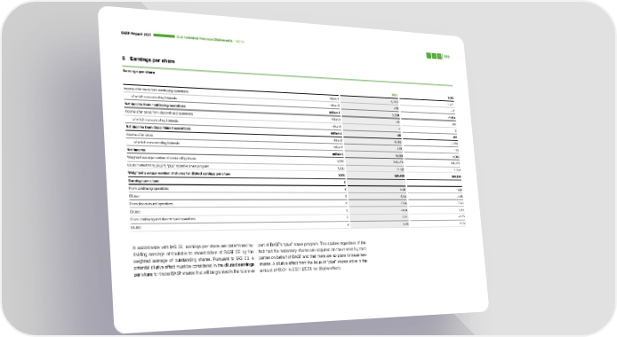 BASF Report 2021 Consoli dated Financial Statements – Notes 220 6 Earnings per share Earnings per share 2021 2020 Income after taxes from continuing operations million € 6,018 –1,471 of which noncontrolling interests million € 459 –17 Net income from continuing operations million € 5,559 –1,454 Income after taxes from discontinued operations million € –36 396 of which noncontrolling interests million € – 2 Net income from discontinued operations million € –36 394 Income after taxes million € 5,982 –1,075 of which noncontrolling interests million € 459 –15 Net income million € 5,523 –1,060 Weighted average number of outstanding shares 1,000 918,479 918,479 Dilution effect from BASF’s “plus” incentive share program 1,000 2,008 1,759 Weighted average number of shares for diluted earnings per share 1,000 920,486 920,238 Earnings per share € From continuing operations € 6.05 –1.58 Diluted € 6.04 –1.58 From discontinued operations € –0.04 0.43 Diluted € –0.04 0.43 From continuing and discontinued operations € 6.01 –1.15 Diluted € 6.00 –1.15 In accordance with IAS 33, earnings per share are determined by part of BASF’s “plus” share program. This applies regardless of the dividing earnings attributable to shareholders of BASF SE by the fact that the necessary shares are acquired on the market by third weighted average of outstanding shares. Pursuant to IAS 33, a parties on behalf of BASF and that there are no plans to issue new potential dilutive effect must be considered in the diluted earnings shares. A dilutive effect from the issue of “plus” shares arose in the per share for those BASF shares that will be granted in the future as amount of €0.01 in 2021 (2020: no dilutive effect).