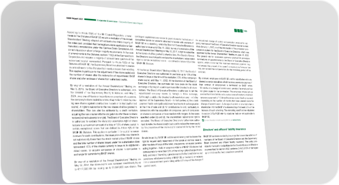 BASF Report 2021 Corporate Governance – Corporate Governance Report 169 According to Article 59(1) of the SE Council Regulation, amend- contingent capital increase serves to grant shares to the holders of An exceptional change of control compensation awarded to out- ments to the Statutes of BASF SE require a resolution of the Annual convertible bonds or warrants attached to bonds with warrants of going members of the Board of Executive Directors has not existed Shareholders’ Meeting adopted with at least a two-thirds majority of BASF SE or a subsidiary, which the Board of Executive Directors is since January 1, 2020, as of the introduction of the amended com- the votes cast, provided that the legal provisions applicable to Ger- authorized to issue up to May 11, 2022, by way of a resolution of the pensation system for the Board of Executive Directors, which was man stock corporations under the German Stock Corporation Act Annual Shareholders’ Meeting on May 12, 2017. A right to subscribe approved by the Annual Shareholders’ Meeting on June 18, 2020. do not stipulate or allow for larger majority requirements. In the case to the bonds shall be granted to shareholders. The Board of Execu- The general rule for severance payments granted for premature of amendments to the Statutes, section 179(2) of the German Stock tive Directors is authorized to exclude the shareholders’ subscription terminations of appointments to the Board of Executive Directors Corporation Act requires a majority of at least three-quarters of the right in certain exceptional cases – as defined in Article 5(9) of the applies, which states that the maximum severance payment may subscribed capital represented. Pursuant to Article 12(6) of the BASF SE Statutes. not exceed the amount of two years’ compensation; however, this Statutes of BASF SE, the Supervisory Board is authorized to resolve may not exceed the compensation for the remaining period of the on amendments to the Statutes that merely concern their wording. At the Annual Shareholders’ Meeting on May 12, 2017, the Board of contract. This applies in particular to the adjustment of the share capital and Executive Directors was authorized to purchase up to 10% of the the number of shares after the redemption of repurchased BASF shares in issue at the time of the resolution (10% of the company’s By contrast, employees of BASF SE and its subsidiaries who are shares and after an issue of shares from authorized capital. share capital) until May 11, 2022. At the discretion of the Board of classed as senior executives will still receive a severance payment if Executive Directors, the purchase can take place on the stock their contract of employment is terminated by BASF within By way of a resolution of the Annual Shareholders’ Meeting on exchange or by way of a public purchase offer directed to all share- 18 months of a change of control event, provided the employee has May 3, 2019, the Board of Executive Directors is authorized, with holders. The Board of Executive Directors is authorized to sell the not given cause for the termination. The employee whose service the consent of the Supervisory Board, to increase, until May 2, repurchased company shares (a) through a stock exchange, contract has been terminated in such a case will receive a maximum 2024, on a one-off basis or in portions on a number of occasions, (b) through a public offer directed to all shareholders and – with the severance payment of 1.5 times the annual salary (fixed component) the company’s share capital by a total of up to €470 million by issu- approval of the Supervisory Board – to third parties, (c) for a cash depending on the number of months that have passed since the ing new shares against contributions in cash or in kind (authorized payment that is not significantly lower than the stock exchange price change of control event. A change of control is assumed when a capital). A right to subscribe to the new shares shall be granted to at the time of sale and (d) for contributions in kind, particularly in shareholder informs BASF of a shareholding of at least 25% or the shareholders. This can also be achieved by a credit institution connection with the acquisition of companies, parts of companies increase of such a holding. The remaining specifications stipulated acquiring the new shares with the obligation to offer these to share- or shares in companies or in connection with mergers. In the cases in section 315a HGB refer to situations that are not applicable to holders (indirect subscription right). The Board of Executive Directors specified under (c) and (d), the shareholders’ subscription right is BASF SE. is authorized to exclude the statutory subscription right of share- excluded. The Board of Executive Directors is furthermore autho- For more information on bonds issued by BASF SE, see basf.com/bonds holders to a maximum amount of a total of 10% of share capital in rized to retire the shares bought back and to reduce the share capital certain exceptional cases that are defined in Article 5(8) of the by the proportion of the share capital accounted for by the retired BASF SE Statutes. This applies in particular if, for capital increases shares. Directors’ and officers’ liability insurance in return for cash contributions, the issue price of the new shares is not substantially lower than the stock market price of BASF shares Bonds issued by BASF SE and its subsidiaries grant the bearer the BASF SE has taken out liability insurance that covers the activities of and the total number of shares issued under this authorization does right to request early repayment of the bonds at nominal value if, members of the Board of Executive Directors and the Supervisory not exceed 10% of the shares currently in issue or, in eligible indi- after the date of issue of the bond, one person – or several persons Board (directors’ and officers’ liability insurance). This policy p