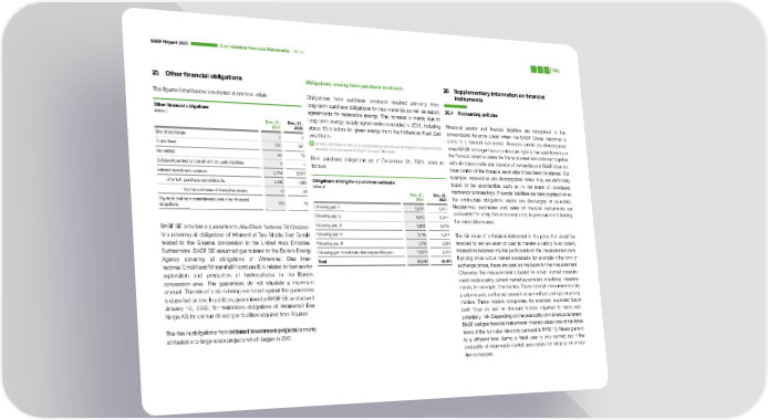 BASF Report 2021 Consoli dated Financial Statements – Notes 263 25 Other financial obligations Obligations arising from purchase contracts 26 Supplementary information on financial instruments The figures listed below are stated at nominal value: Obligations from purchase contracts resulted primarily from long-term purchase obligations for raw materials as well as supply 26.1 Accounting policies Other financial obligations agreements for renewable energy. The increase is mainly due to Million € long-term energy supply agreements concluded in 2021, including Financial assets and financial liabilities are recognized in the Dec. 31, Dec. 31, about €3.5 billion for green energy from the Hollandse Kust Zuid consolidated balance sheet when the BASF Group becomes a 2021 2020 Bills of exchange 3 2 wind farm. party to a financial instrument. Financial assets are derecognized For more information on long-term energy supply agreements, see the chapter on Energy and climate when BASF no longer has a contractual right to the cash flows from Guarantees 383 347 protection in the Management’s Report from page 126 onward the financial asset or when the financial asset is transferred together Warranties 58 79 Firm purchase obligations as of December 31, 2021, were as with all material risks and rewards of ownership and BASF does not Collateral granted on behalf of third-party liabilities 1 – follows: have control of the financial asset after it has been transferred. For Initiated investment projects 4,761 3,921 example, receivables are derecognized when they are definitively of which purchase commitments 1,481 1,052 Obligations arising from purchase contracts found to be uncollectible such as in the event of concluded Million € insolvency proceedings. Financial liabilities are derecognized when for the purchase of intangible assets 10 15 Dec. 31, Dec. 31, the contractual obligations expire, are discharged or cancelled. Payment and loan commitments and other financial 2021 2020 obligations 263 75 Following year 1 9,686 8,003 Regular-way purchases and sales of financial instruments are accounted for using the settlement date; in precious metal trading, Following year 2 4,963 5,347 the trade date is used. BASF SE provides a guarantee to Abu Dhabi National Oil Corpora- Following year 3 1,832 3,419 tion covering all obligations of Wintershall Dea Middle East GmbH Following year 4 1,716 1,317 The fair value of a financial instrument is the price that would be related to the Ghasha concession in the United Arab Emirates. Following year 5 1,720 1,238 received to sell an asset or paid to transfer a liability in an orderly Furthermore, BASF SE assumed guarantees to the Danish Energy Following year 6 and maturities beyond this year 11,823 4,165 transaction between market participants at the measurement date. Agency covering all obligations of Wintershall Dea Inter- Total 31,741 23,489 If pricing on an active market is available, for example in the form of national GmbH and Wintershall Noordzee B.V. related to licenses for exchange prices, these are used as the basis for the measurement. exploration and production of hydrocarbons in the Danish Otherwise, the measurement is based on either internal measure- concession area. The guarantees do not stipulate a maximum ment models using current market parameters or external measure- amount. The risk of a claim being exercised against the guarantees ments, for example, from banks. These internal measurements rely is classified as low. In addition, guarantees by BASF SE existed until predominantly on the net present value method and option pricing January 12, 2022, for restoration obligations of Wintershall Dea models. These models incorporate, for example, expected future Norge AS for various oil and gas facilities acquired from Equinor. cash flows as well as discount factors adjusted for term and, potentially, risk. Depending on the availability of market parameters, The rise in obligations from initiated investment projects is mainly BASF assigns financial instruments’ market values one of the three attributable to large-scale projects which began in 2021. levels of the fair value hierarchy pursuant to IFRS 13. Reassignment to a different level during a fiscal year is only carried out if the availability of observable market parameters for identical or similar items changes.