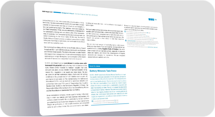 BASF Report 2021 Management’s Report – We Value People and Treat Them with Respect 105 perspectives and to deal more openly with critical situations. At the including and especially there – and contribute to the respect of We report on our global targets, monitoring systems and measures same time, the renowned external experts show us where we have human rights. to integrate human rights topics into our business activities in publi- potential for improvement and help us to build on our strengths in cations such as this report and online. how we handle human rights. The meetings, which are chaired by We have trustful working relationships with our partners (customers, For more information on standards in our supply chain, see page 109 onward our Chief Compliance Officer, are also attended by employees from suppliers, joint venture partners, contractors), expect them to com- For more information on raw materials, see page 112 onward the sustainability strategy and compliance units. Other repre sen ta- ply with internationally recognized human rights standards and to For more information on our production standards, see page 119 onward tives, for example, from the operating divisions or procurement, are demand the same of their partners further along the value chain. We For more information on systems for monitoring labor and social standards, see page 103 onward invited depending on the focus topics. In this way, the Human support our partners in their efforts to meet their respective For more information on corporate governance and compliance, see page 161 onward Rights Advisory Council provides an external perspective on estab- responsibilities. See basf.com/humanrights for more information on the human rights position and a comprehensive report on the implementation of due diligence in human rights in accordance with the requirements of lishing and improving our processes, and contributes this in discus- the National Action Plan developed by the German government, and in accordance with the sions with the leadership team. We can only meet our goal of eradicating human rights abuses U.N. Guiding Principles on Business and Human Rights along our value chains if we work together. We have defined our For more information on the Human Rights Advisory Council, see basf.com/human-rights-council We maintained our dialog with the Human Rights Advisory Council expectations in a binding Supplier Code of Conduct. We are in throughout 2021, both with the body as a whole and in small groups, close contact with our business partners, especially in higher-risk and with individual experts. The topics discussed included respon- areas and regions, and monitor the implementation of required sible supply chain management, for example in challenging supplier standards and measures for improvement. We use recognized relationships or in high-risk regions. Our contribution to the respon- assessments and audits to verify this. sible use of our solutions and products was also discussed. In 2021, we stepped up our commitment to action areas with increased risk potential, such as battery materials (see box on the Good to know right). Where conflict minerals (tin, tantalum, tungsten, their ores and gold) are used, we pay attention to the implementation of the Battery Minerals Task Force relevant E.U. regulation in our supply and value chains. We also set store on certified sustainable supply chains and fair working In 2021, BASF established a Battery Minerals Task Force to meet conditions in the procurement of raw materials such as palm oil, the specific challenges associated with the growing demand for palm kernel oil and castor oil. We maintain dialog with national and battery materials. It bundles the expertise of the Catalysts division international NGOs and are involved in numerous networks and and various functional units. The initiative was formed to address partnerships (see page 113 onward). These include the Cobalt for the risks and opportunities of our global raw material supply Development initiative in the Democratic Republic of Congo, the chains for battery materials from a sustainability viewpoint and Responsible Lithium Partnership in Chile, the Global Battery Alliance steer the resulting activities. The aim is to ensure the responsible and the Roundtable on Sustainable Palm Oil (RSPO). procurement of battery materials. The task force is also respon- sible for the ongoing development of our internal guidelines to As an international company, we are a part of society in the coun- ensure their continuous improvement and adaptation to new tries in which we operate and have business relationships with regulatory requirements, as well as to take account of develop- partners around the world. We are confronted by the fact that there ments in our business areas. are states that do not honor their obligation to protect human rights. For more information on supplier management, see page 109 onward People are particularly at risk in such countries and companies’ For more information on mineral raw materials, see page 115 onward ability to act is often limited. We are committed to our values –