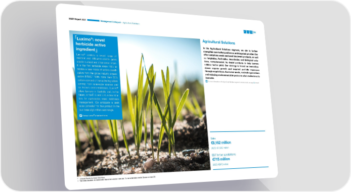 BASF Report 2021 Management’s Report – Agricultural Solutions 88 Agricultural Solutions ® Luximo : novel In the Agricultural Solutions segment, we aim to further herbicide active strengthen our market position as an integrated provider. Our ingredient offer comprises seeds and seed treatment products, as well as fungicides, herbicides, insecticides and biological solu- ® Luximo controls a broad range of tions, complemented by digital products to help farmers resistant and difficult-to-control grass achieve better yield. Our strategy is based on innovation- weeds in wheat and other cereal crops. driven organic growth and targeted portfolio expansion It is the first herbicide since 1985 to through acquisitions. Customer needs, societal expectations receive a new mode of action classifi- and reducing environmental impacts are what motivate us to cation from the global industry organi- innovate. zation HRAC.* With more than 50% For more information on the Agricultural Solutions segment’s business model, see page 33 onward carbon content of the active ingredient coming from renewable sources and no known cross-resistance, Luximo® offers farmers in Australia and, in the future, in the E.U. and U.K. a new solu- tion for sustainable weed resistance management. We anticipate a peak 1 sales potential for this product in the low three-digit million euro range. Discover Luximo® at basf.com/luximo Sales €8,162 million 2020: €7,660 million EBIT before special items €715 million 2020: €970 million * Herbicide Resistance Action Committee 1 Peak sales describes the highest sales value to be expected in one year. For more information, see the Glossary on page 289.