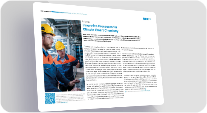 In Focus: Innovative Processes BASF Report 2021 Management’s Report – In Focus: Innovative Processes 132 In focus: Innovative Processes for Climate-Smart Chemistry Most of our production processes are already highly optimized. This makes it increasingly difficult to implement further improvements to reduce CO . Completely new technologies are needed to reduce 2 greenhouse gas emissions over the long term and on a large scale. Different teams are working on this in our Carbon Management R&D Program. Our focus here is on the production of basic chemicals such as It will provide insights into the heating concept, as well as the use of hydrogen. The element is needed as a reaction partner in many new types of materials. processes. The processes currently used to produce hydrogen, such as steam reforming, produce high levels of CO emissions. That is Another focus area is alternative heating concepts for our steam 2 why BASF is open to different technologies and is driving forward cracker furnaces (see page 72). We use these plants to split two alternative processes for climate-smart hydrogen production: petroleum into olefins and aromatics. This requires temperatures of water electrolysis and methane pyrolysis. In water electrolysis, around 850 degrees Celsius, which are normally achieved by burning water is split directly into its two components, hydrogen and oxygen. fossil fuels – which emits high levels of CO . A fundamentally new 2 If the required energy comes from renewable sources, the process is heating concept based on electric resistance heating ( eFurnace) and carbon-free. We intend to use the hydrogen generated by water the use of renewable energy could eliminate up to 90% of process- electrolysis primarily as a material in the BASF Verbund and also, to related emissions in the future. To develop and pilot the concept, we a limited extent, for hydrogen model region projects in Germany’s signed a cooperation agreement with SABIC and Linde in 2021 and Rhine-Neckar region. We are currently working with Siemens Energy jointly applied for funding to build a demonstration plant. on initial concepts for the construction of a PEM (proton exchange membrane) water electrolyzer with a capacity of 50 megawatts at the In addition to new, low-carbon production processes, we are also Ludwigshafen site in Germany. We are also exploring various options investigating the use of innovative carbon storage methods. for project funding. At the Antwerp site in Belgium, BASF plans to invest in one of the largest carbon capture and storage (CCS) projects under the North In parallel, we are developing methane pyrolysis technology Sea together with its Antwerp@C consortium partners. The project together with partners from academia and industry in a project spon- can potentially avoid more than one million metric tons of CO2 sored by the German Federal Ministry of Education and Research. emissions per year from the production of basic chemicals. A final In this innovative process, (bio)methane is split directly into hydrogen investment decision is targeted for 2022. Hydrogen is a key element on the journey to climate neutrality. BASF and solid carbon. The process requires around 80% less electricity For more information on carbon management, see basf.com/carbon-management is developing a process – methane pyrolysis – that significantly than water electrolysis and is virtually carbon-free if renewable energy reduces carbon emissions in the production of hydrogen. Find out is used. Following extensive groundwork, we started up a test plant more about what drives project manager Dieter Flick and which for methane pyrolysis at the Ludwigshafen site in Germany in 2021. groundbreaking technologies are still being researched in the online report at report.basf.com.
