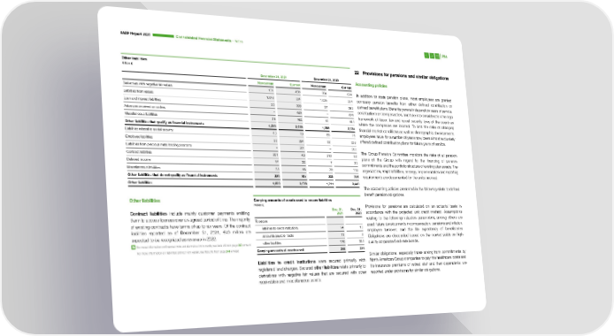 BASF Report 2021 Consoli dated Financial Statements – Notes 254 Other liabilities 22 Provisions for pensions and similar obligations Million € December 31, 2021 December 31, 2020 Accounting policies Noncurrent Current Noncurrent Current Derivatives with negative fair values 131 438 284 674 In addition to state pension plans, most employees are granted Liabilities from leases 1,078 334 1,026 334 company pension benefits from either defined contribution or Loan and interest liabilities 35 505 37 583 defined benefit plans. Benefits generally depend on years of service, Advances received on orders – 949 – 679 contributions or compensation, and take into consideration the legal framework of labor, tax and social security laws of the countries Miscellaneous liabilities 26 753 41 464 where the companies are located. To limit the risks of changing Other liabilities that qualify as financial instruments 1,270 2,978 1,388 2,734 financial market conditions as well as demographic developments, Liabilities related to social security 63 79 55 76 employees have, for a number of years now, been almost exclusively Employee liabilities 22 294 22 238 offered defined contribution plans for future years of service. Liabilities from precious metal trading positions – 201 – 200 Contract liabilities 201 40 210 52 The Group Pension Committee monitors the risks of all pension plans of the Group with regard to the financing of pension Deferred income 17 32 7 26 commitments and the portfolio structure of existing plan assets. The Miscellaneous liabilities 28 56 29 114 organization, responsibilities, strategy, implementation and reporting Other liabilities that do not qualify as financial instruments 330 701 323 706 requirements are documented for the units involved. Other liabilities 1,600 3,679 1,711 3,440 The accounting policies presented in the following relate to defined benefit pension obligations. Other liabilities Carrying amounts of assets used to secure liabilities Million € Provisions for pensions are calculated on an actuarial basis in Contract liabilities include mainly customer payments entitling Dec. 31, Dec. 31, accordance with the projected unit credit method. Assumptions 2021 2020 them to access licenses over an agreed period of time. The majority To secure relating to the following valuation parameters, among others are of existing contracts have terms of up to six years. Of the contract used: future developments in compensation, pensions and inflation, liabilities reported as of December 31, 2021, €40 million are liabilities to credit institutions 64 13 employee turnover, and the life expectancy of beneficiaries. expected to be recognized as revenue in 2022. accounts payable, trade 11 2 Obligations are discounted based on the market yields on high- For more information on financial risks and derivative instruments, see Note 26 from page 263 onward other liabilities 170 264 quality corporate fixed-rate bonds. For more information on liabilities arising from leases, see Note 16 from page 244 onward Carrying amounts of assets used 245 279 Similar obligations, especially those arising from commitments by Liabilities to credit institutions were secured primarily with North American Group companies to pay the healthcare costs and registered land charges. Secured other liabilities relate primarily to life insurance premiums of retired staff and their dependents, are derivatives with negative fair values that are secured with other reported under provisions for similar obligations. receivables and miscellaneous assets.