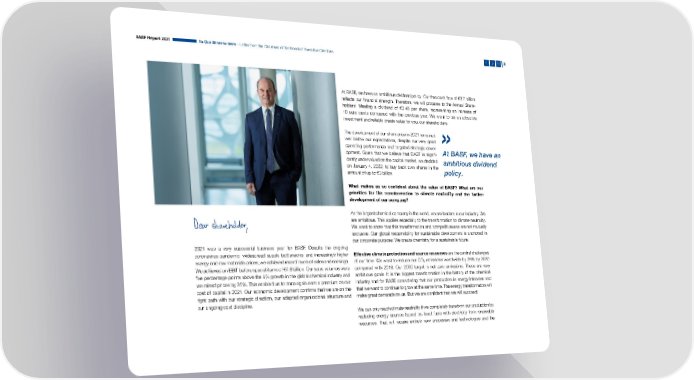 Letter from the Chairman of the Board of Executive Directors BASF Report 2021 To Our Shareholders – Letter from the Chairman of the Board of Executive Directors 8 At BASF, we have an ambitious dividend policy. Our free cash flow of €3.7 billion reflects our financial strength. Therefore, we will propose to the Annual Share- holders’ Meeting a dividend of €3.40 per share, representing an increase of 10 euro cents compared with the previous year. We want to be an attractive investment and reliably create value for you, our shareholders. The development of our share price in 2021 remained well below our expectations, despite our very good » operating performance and targeted strategic devel- At BASF, we have an op ment. Given that we believe that BASF is signifi- cantly under valued on the capital market, we decided ambitious dividend on January 4, 2022, to buy back own shares in the policy. amount of up to €3 billion. What makes us so confident about the value of BASF? What are our priorities for the transformation to climate neutrality and the further development of our company? As the largest chemical company in the world, we are leaders in our industry. We are ambitious. This applies especially to the transformation to climate neutrality. We want to show that this transformation and competitiveness are not mutually exclusive. Our global responsibility for sustainable development is anchored in our corporate purpose: We create chemistry for a sustainable future. 2021 was a very successful business year for BASF. Despite the ongoing coronavirus pandemic, widespread supply bottlenecks, and increasingly higher Effective climate protection and scarce resources are the central challenges energy and raw materials prices, we achieved record levels of sales and earnings. of our time. We want to reduce our CO2 emissions worldwide by 25% by 2030 We achieved an EBIT before special items of €7.8 billion. Our sales volumes were compared with 2018. Our 2050 target is net zero emissions. These are very five percentage points above the 6% growth in the global chemical industry and ambitious goals. It is the biggest transformation in the history of the chemical we raised prices by 25%. This enabled us to once again earn a premium on our industry and for BASF, considering that our production is energy intensive and cost of capital in 2021. Our economic development confirms that we are on the that we want to continue to grow at the same time. The energy transformation will right path with our strategic direction, our adapted organizational structure and make great demands on us. But we are confident that we will succeed! our ongoing cost discipline. We can only reach climate neutrality if we completely transform our production by replacing energy sources based on fossil fuels with electricity from renewable resources. That will require entirely new processes and technologies and the