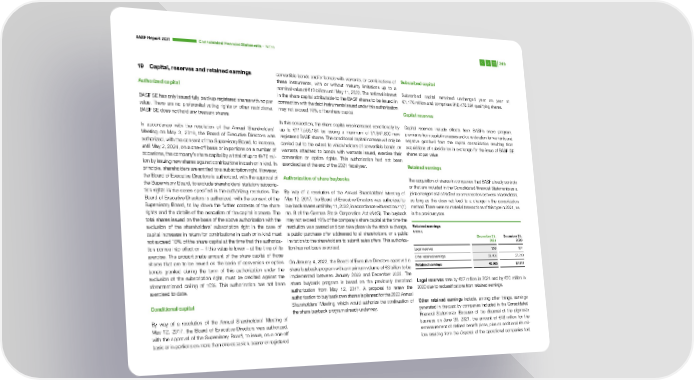 BASF Report 2021 Consoli dated Financial Statements – Notes 249 19 Capital, reserves and retained earnings convertible bonds and/or bonds with warrants, or combinations of Subscribed capital these instruments, with or without maturity limitations up to a Authorized capital nominal value of €10 billion until May 11, 2022. The notional interest Subscribed capital remained unchanged year on year at in the share capital attributable to the BASF shares to be issued in €1,176 million and comprises 918,478,694 qualifying shares. BASF SE has only issued fully paid-up registered shares with no par connection with the debt instruments issued under this authorization value. There are no preferential voting rights or other restrictions. may not exceed 10% of the share capital. Capital reserves BASF SE does not hold any treasury shares. In this connection, the share capital was increased conditionally by Capital reserves include effects from BASF’s share program, In accordance with the resolution of the Annual Shareholders’ up to €117,565,184 by issuing a maximum of 91,847,800 new premiums from capital increases and consideration for warrants and Meeting on May 3, 2019, the Board of Executive Directors was registered BASF shares. The conditional capital increase will only be negative goodwill from the capital consolidation resulting from authorized, with the consent of the Supervisory Board, to increase, carried out to the extent to which holders of convertible bonds, or acquisitions of subsidiaries in exchange for the issue of BASF SE until May 2, 2024, on a one-off basis or in portions on a number of warrants attached to bonds with warrants issued, exercise their shares at par value. occasions, the company’s share capital by a total of up to €470 mil- conversion or option rights. This authorization had not been lion by issuing new shares against contributions in cash or in kind. In exercised as of the end of the 2021 fiscal year. Retained earnings principle, shareholders are entitled to a subscription right. However, the Board of Executive Directors is authorized, with the approval of Authorization of share buybacks The acquisition of shares in companies that BASF already controls the Supervisory Board, to exclude shareholders’ statutory subscrip- or that are included in the Consolidated Financial Statements as a tion rights in the cases specified in the authorizing resolution. The By way of a resolution of the Annual Shareholders’ Meeting of joint arrangement is treated as a transaction between shareholders, Board of Executive Directors is authorized, with the consent of the May 12, 2017, the Board of Executive Directors was authorized to as long as this does not lead to a change in the consolidation Supervisory Board, to lay down the further contents of the share buy back shares until May 11, 2022, in accordance with section 71(1) method. There were no material transactions of this type in 2021, as rights and the details of the execution of the capital increase. The no. 8 of the German Stock Corporation Act (AktG). The buyback in the previous year. total shares issued on the basis of the above authorization with the may not exceed 10% of the company’s share capital at the time the exclusion of the shareholders’ subscription right in the case of resolution was passed and can take place via the stock exchange, Retained earnings capital increases in return for contributions in cash or in kind must a public purchase offer addressed to all shareholders, or a public Million € not exceed 10% of the share capital at the time that this authoriza- invitation to the shareholders to submit sales offers. This authoriza- December 31, December 31, 2021 2020 tion comes into effect or – if this value is lower – at the time of its tion has not been exercised. Legal reserves 958 901 exercise. The proportionate amount of the share capital of those shares that are to be issued on the basis of conversion or option On January 4, 2022, the Board of Executive Directors approved a Other retained earnings 39,407 37,010 bonds granted during the term of this authorization under the share buyback program with a maximum volume of €3 billion to be Retained earnings 40,365 37,911 exclusion of the subscription right, must be credited against the implemented between January 2022 and December 2023. The aforementioned ceiling of 10%. This authorization has not been share buyback program is based on the previously described Legal reserves rose by €57 million in 2021 and by €70 million in exercised to date. authorization from May 12, 2017. A proposal to renew the 2020 due to reclassifications from retained earnings. authorization to buy back own shares is planned for the 2022 Annual Conditional capital Shareholders’ Meeting, which would authorize the continuation of Other retained earnings include, among other things, earnings the share buyback program already underway. generated in the past by companies included in the Consolidated By way of a resolution of the Annual Shareholders’ Meeting of Financial Statements. Because of the disposal of the pigments May 12, 2017, the Board of Executive Directors was authorized, business on June 30, 2021, the amount of €48 million for the with the approval of the Supervisory Board, to issue, on a one-off remeasurement of defined benefit plans, plus an additional €6 mil- basis or in portions on more than one occasion, bearer or registered lion resulting from the disposal of the operational companies held